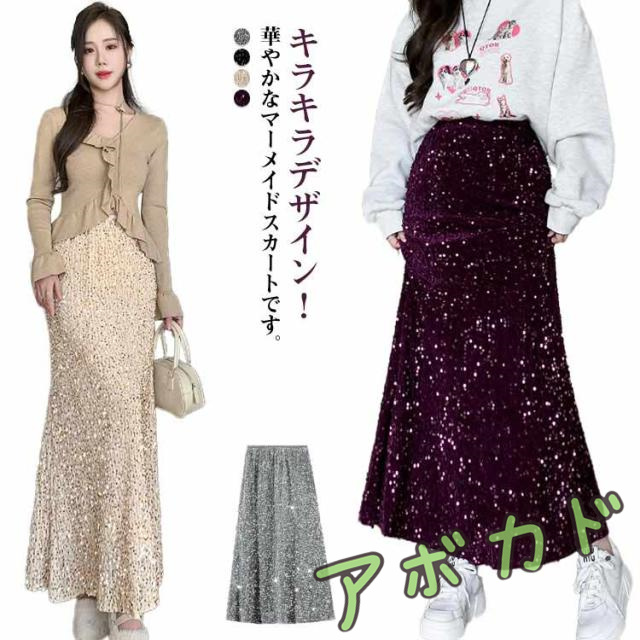 スパンコール ハイウェストスカート ロング マーメイドスカート おしゃれ カジュアル スカート 冬 スパンコール 光沢 ロングスカート 大人 秋 スパンコール 結婚式 パーティー お出かけ 韓国 キラキラ S M L