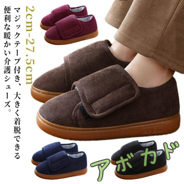 | マジックテープ付き、大きく着脱できる便利な暖かい介護シューズ。 むくみや腫れ、甲高幅広にも対応します。 歩行が安定する靴底、接地面が広く、軽くて歩きやすい。 もこもこ裏起毛付き、防寒効果抜群! 快適な穿き心地で、足が疲れず、足が痛くない。 長い時間歩いても疲れない。「ちょっとそこまで」のお出かけに。入院や施設入所での室内履きに 高齢者の方に大人気の商品、敬老の日のや父の日・母の日の贈り物としてもお勧めです。 | |