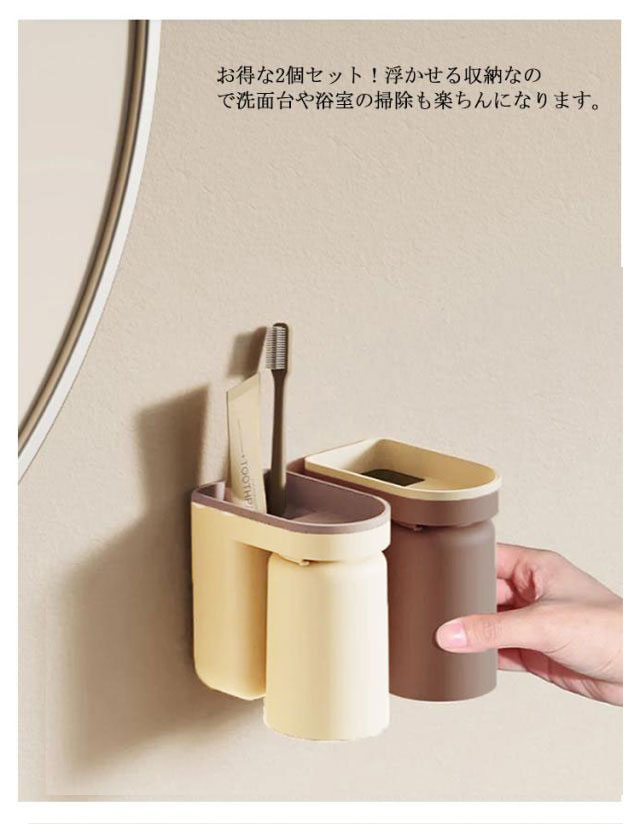 | 場所を取らずに洗面所すっきり収納できる歯ブラシホルダー。 小物収納付きで、歯ブラシ・歯磨き粉・化粧品・くし・コスメ用品・シェーバーなどを置くことができます。 取り外し便利で、コップの入口が底を向けて水気がすぐ流れ落ちる!早く乾燥できてサラサラ衛生的! 歯ブラシ、歯磨き粉、フロスなどをまとめて収納でき、洗面所がスッキリ。 お得な2個セット!浮かせる収納なので洗面台や浴室の掃除も楽ちんになります。 | |