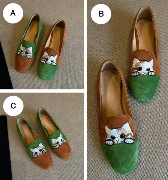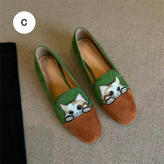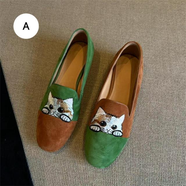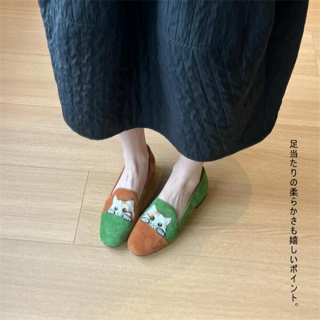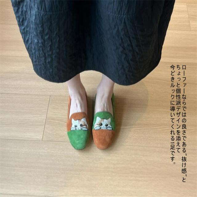 ローファー レディース シューズ 靴 パンプス ラウンドトゥ フラット底 美脚 ぺたんこ スエード 刺繍 猫柄 レトロ チャイナ風 大人かわいい コンフォート きれいめ 履きやすい 歩きやす おしゃれ