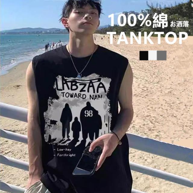 ノースリーブTシャツ メンズ タンクトップ おしゃれ クルーネック プリント ノースリーブ Tシャツ ノースリーブtシャツ トップス ヒップホップ風 夏服 大きいサイズ ゆったり ストリー カジュアル
