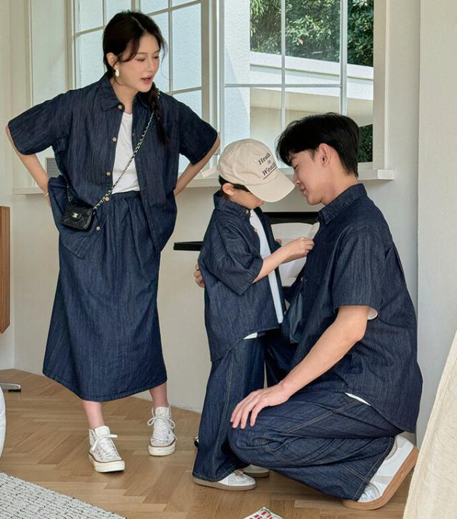 親子ペアルック 4人 半袖 シャツ スカート ロングパンツ デニムシャツ デニム セットアップ 親子お揃い ママ パパ 子供 男の子 女の子 可愛い かっこいい 大きいサイズ 親子コーデ 家 おしゃれ