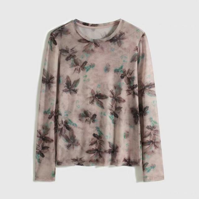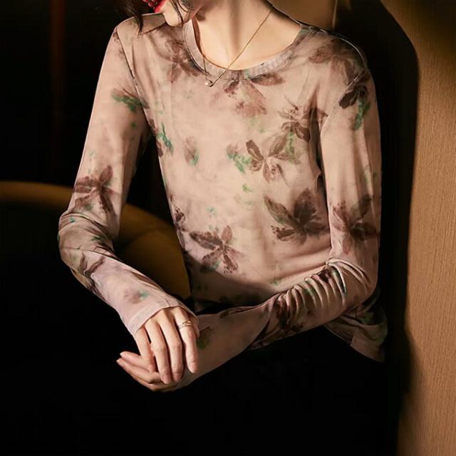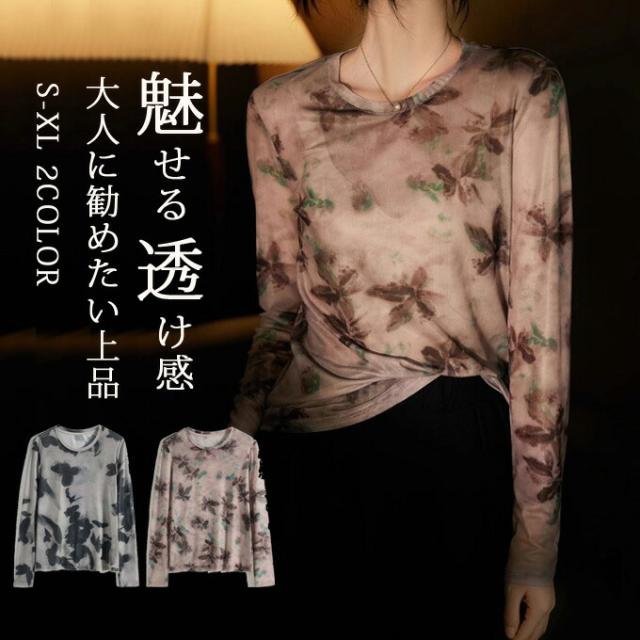 シアートップス レディース 長袖 シアーシャツ シアーブラウス インナー カットソー 春夏 Tシャツ シースルー 透け感 大きいサイズ プリント レイヤード 薄手 ラウンドネックタイダイ 水彩 重ね着