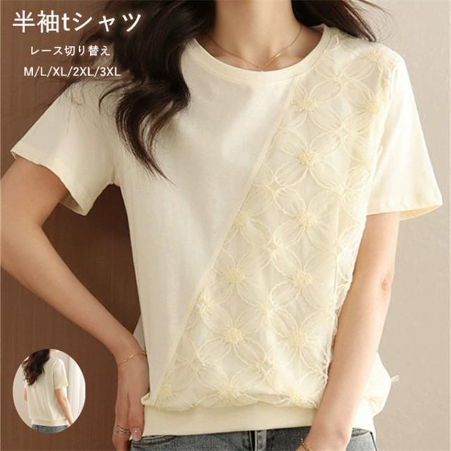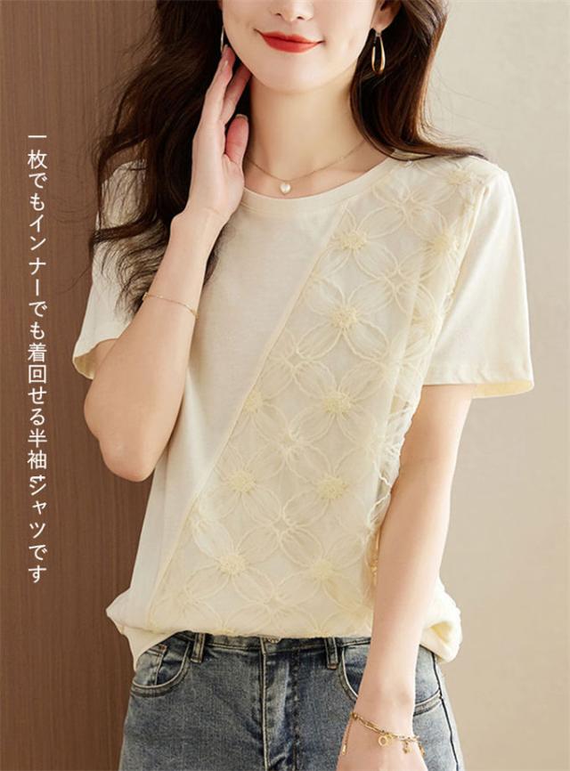 半袖tシャツ レディース tシャツ 半袖 レース切り替え クルーネック ショート丈 無地 コーデ シンプル 薄手 大人可愛い インナー カジュアル オフィス ナチュラル おしゃれ キレイめ ビジネス