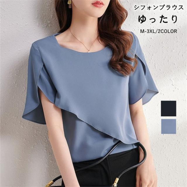 シフォンブラウス レディース 半袖 シ レディースファッション 超目玉商品 ブルーグレー ブラック M L XL 2XL 3XL