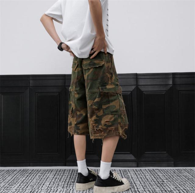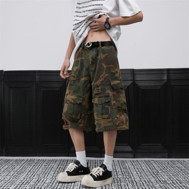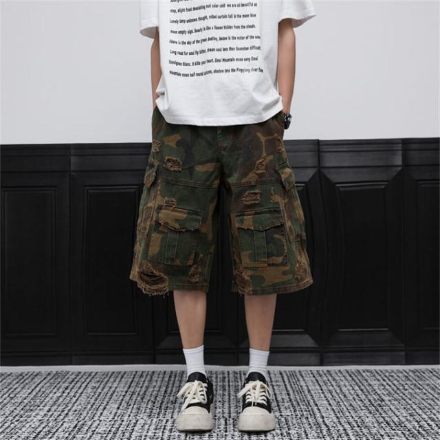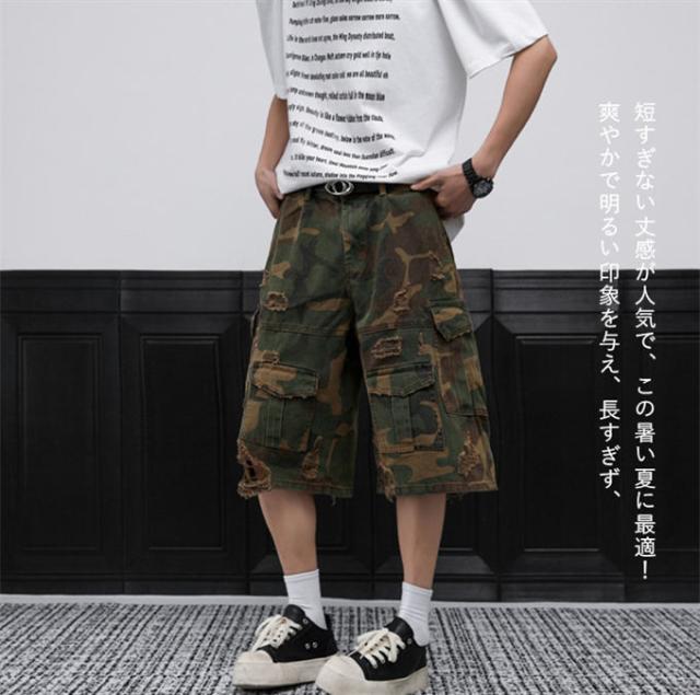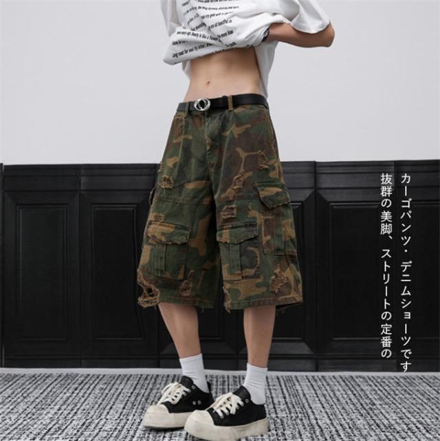 デニムパンツ メンズ 迷彩柄 ダメージデニムパンツ ワイドパンツ ガウチョパンツ カーゴパンツ ビッグポケット ショートパンツ ワイド クロップドパンツ ひざ下 夏服 七分丈 デニム ジーパン 7分丈