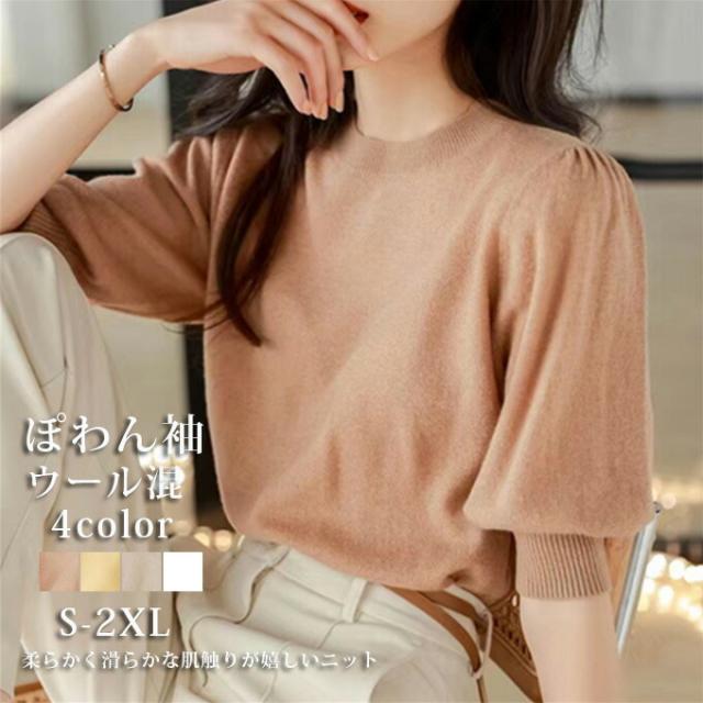 ニット セーター 五分袖 ブラウス ウール混 レディース クールネック 大きいサイズ 体型カバー インナー トップス ショート丈 ボリュームタックスリーブ 着痩せ 楽ちん ストレッチ 柔らかい 肌着