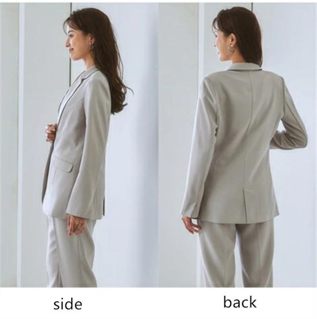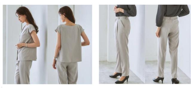 コメント:薄すぎず厚過ぎずの生地感で、きちんと見えします。ブラウスは首回りゆったりで鎖骨がしっかり見え、女性らしいデザインです。ブラウスもジャケットも全体的にゆったりめです。ジャケットはお尻がしっかり隠れるロング丈で、こなれ感が出ます。パンツはちょうどフルレングスになる丈感でした。