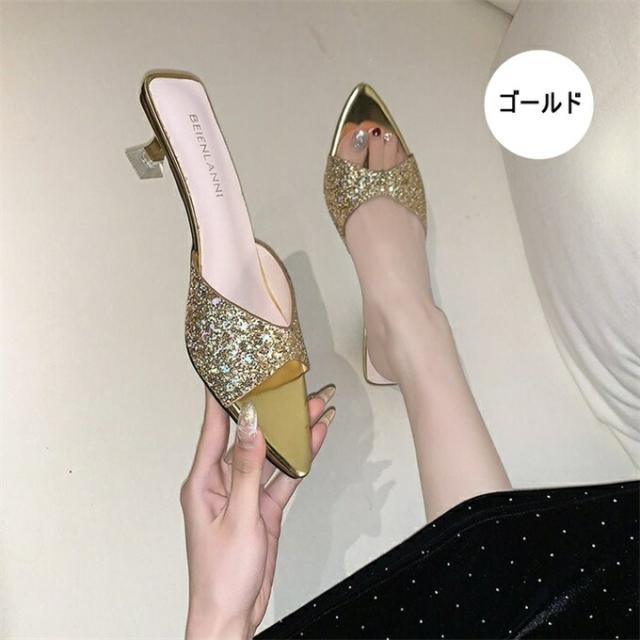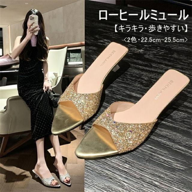 ミュールサンダル レディース つっかけ ピンヒール ローヒール 細ヒール 靴 シューズ 安定感 キラキラ 歩きやすい 痛くない 女性用 お洒落 きれいめ オフィス フォーマル フェミニン 結婚式 通勤