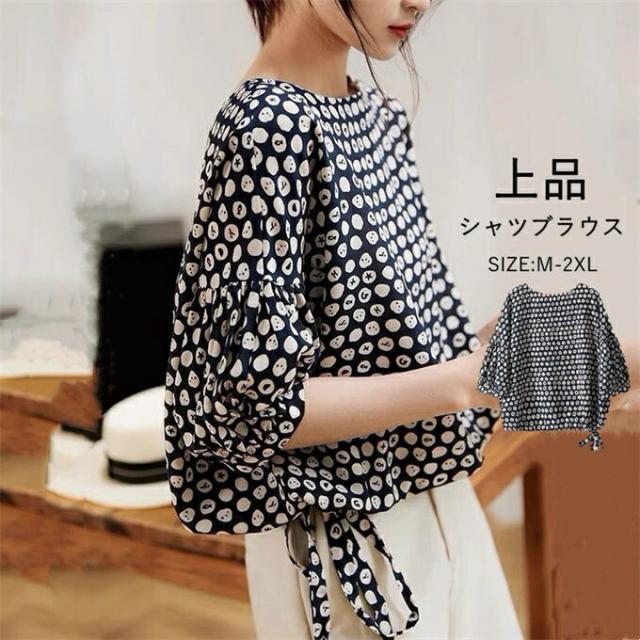 ブラウス レディース 五分袖 シャツブラウス プリント 水玉柄 プルオーバー 夏ブラウス ゆったり 大きいサイズ 体型カバー 着痩せ オフィス カジュアル おしゃれ お洒落 大人可愛い 通勤 O 上品