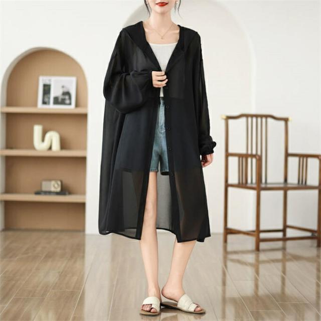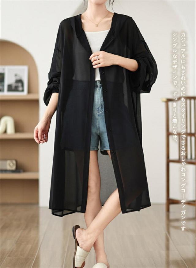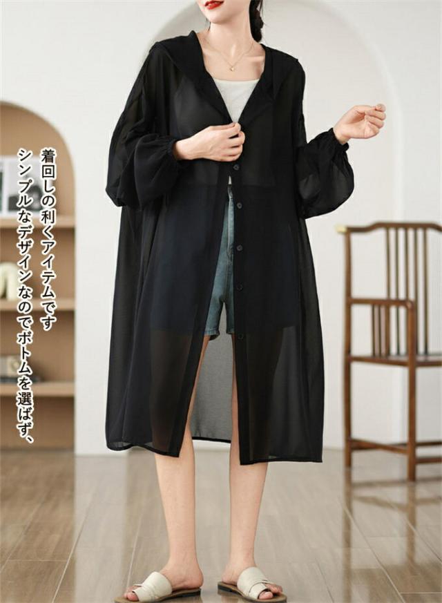 サマーカーディガン レディース シフォン ロングカーディガン UVカット 冷房対策 紫外線対策 フード付き シャツカーディガン 薄手 シースルー 透け感 おしゃれ 可愛い 体型カバー 着痩せ 羽織り