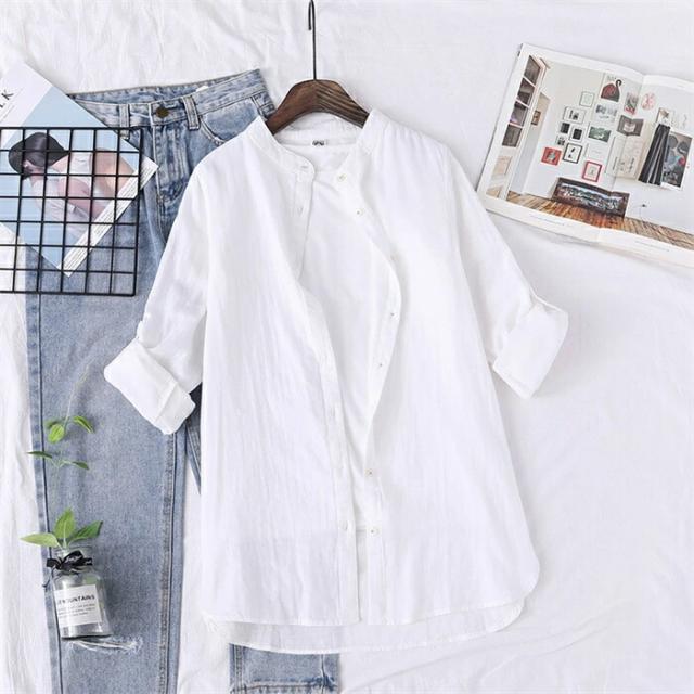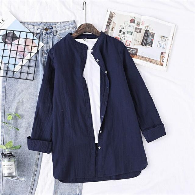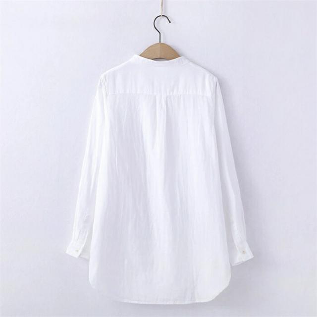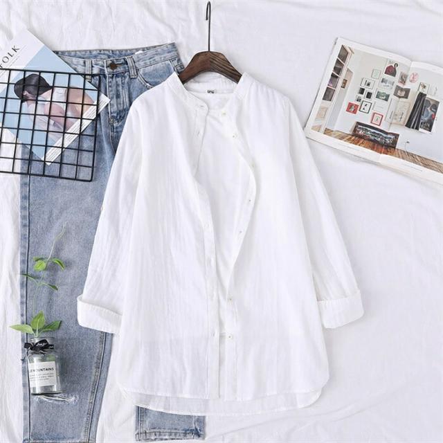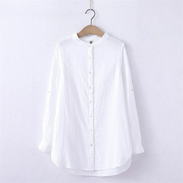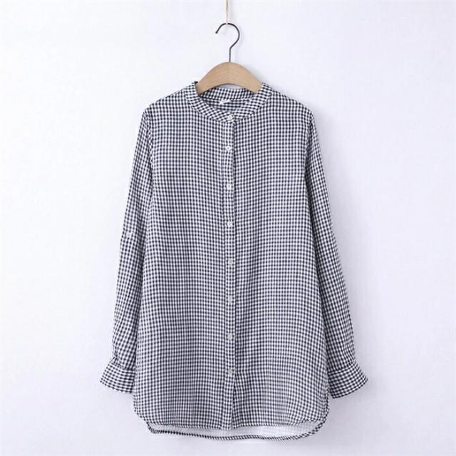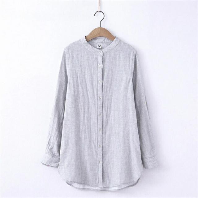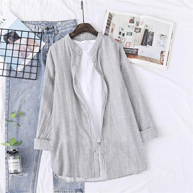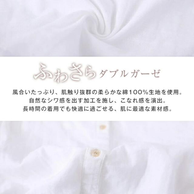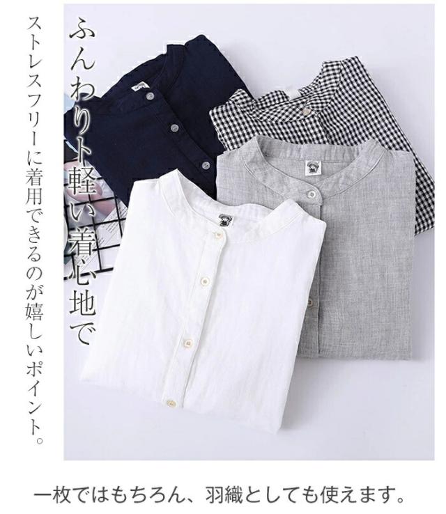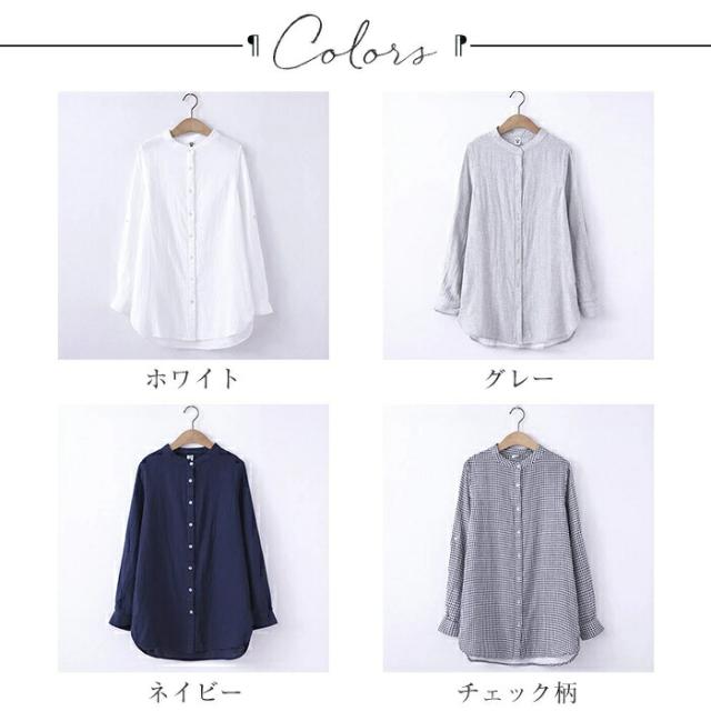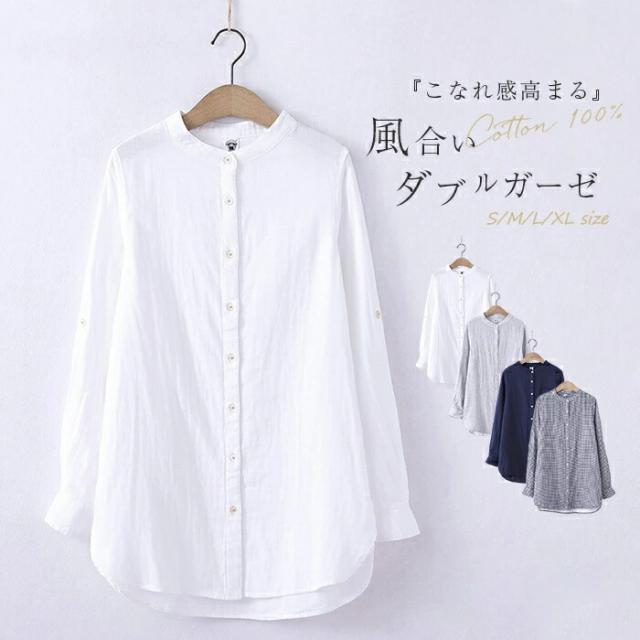 ダブルガーゼ シャツ レディース 長袖 ブラウス チュニック おしゃれ オフェス 白 コットン100% 綿100% 2重ガーゼ ガーゼシャツ スタンドカラー トップス チェック柄 無地 20代 立ち襟