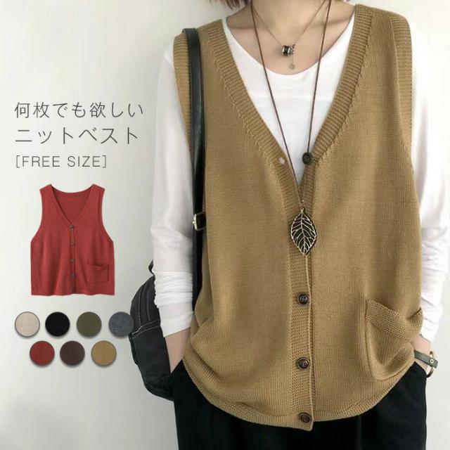 ベスト レディース ニットベストVネック トップス ノースリーブ 春 秋 冬 前開き ゆったり シンプル 無地 羽織 前開きニットベスト スクールニット 薄手 ボタン カジュアル レイ ニットセーター