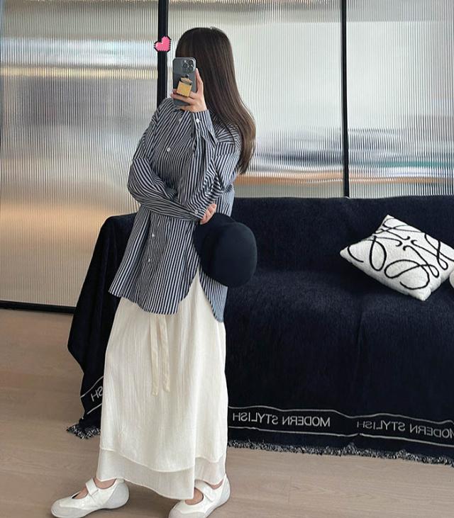 落ち感のあるさらりとした生地が、広がりすぎないきれいなシルエットを作り出す巻きスカート。