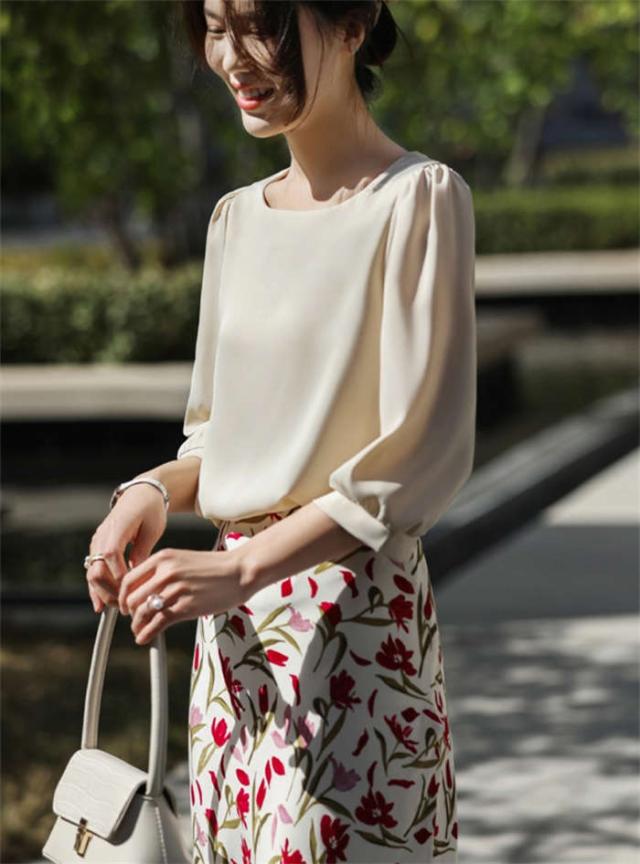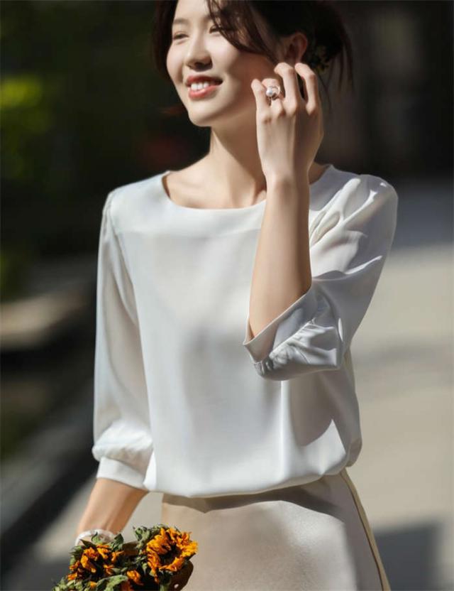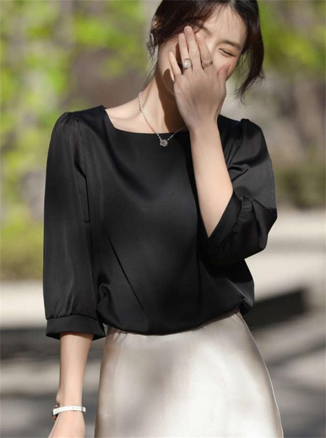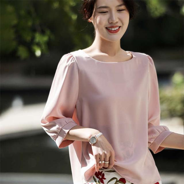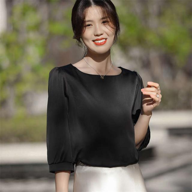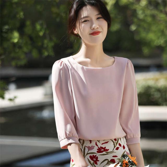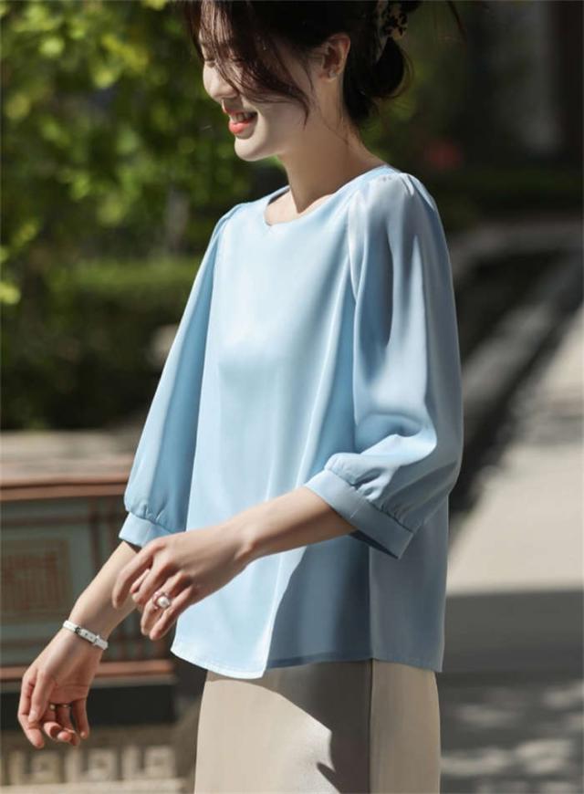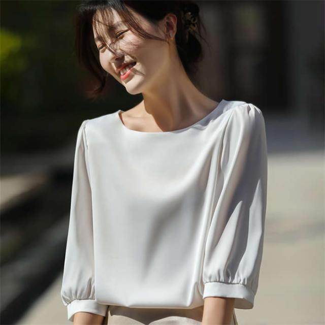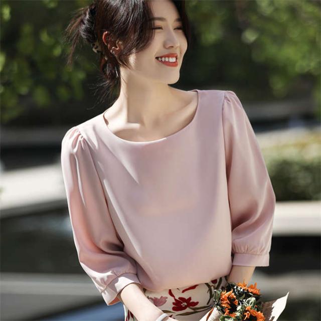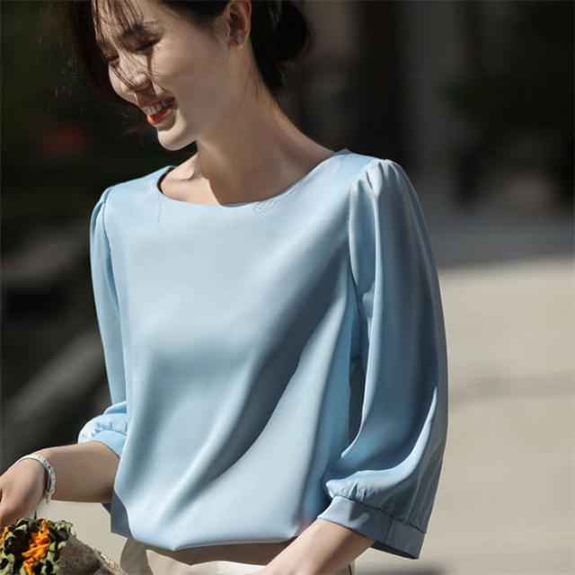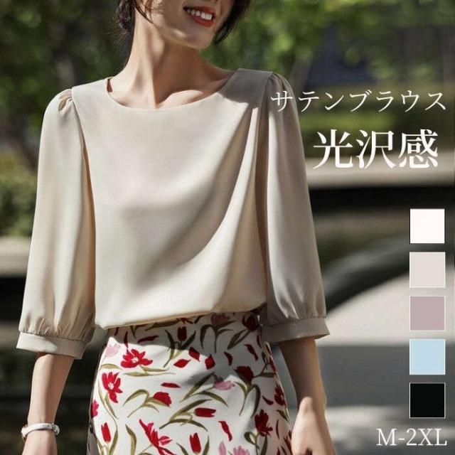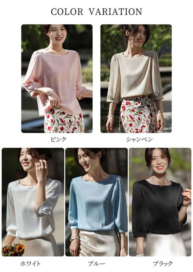 ブラウス シャツブラウス シャツ サテン調 トップス 7分袖 春 夏 可愛い プルオーバー シンプル 無地 ラウンドネック インナー シルクタッチ オフィス 着痩せ 冷感 大人 フォーマル O 光沢感