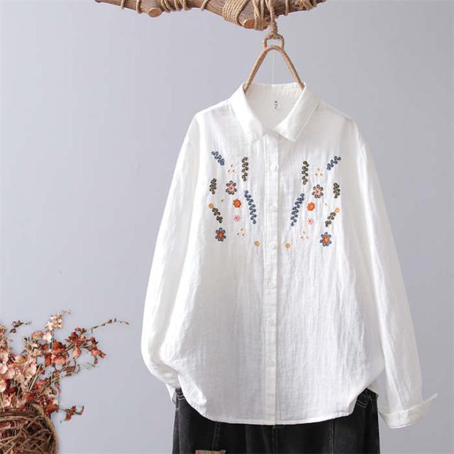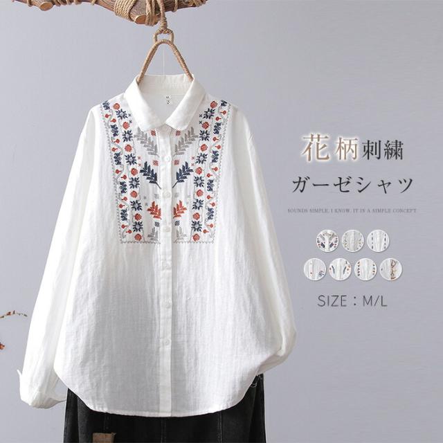 ガーゼ シャツ ブラウス 刺繍 花柄 折り襟 シャツブラウス トップス レディース 長袖 綿 コットン シンプル 前開き 羽織り 春 夏 秋 冬 柔らかい エスニック 通勤 オフィス 着回し エ OL