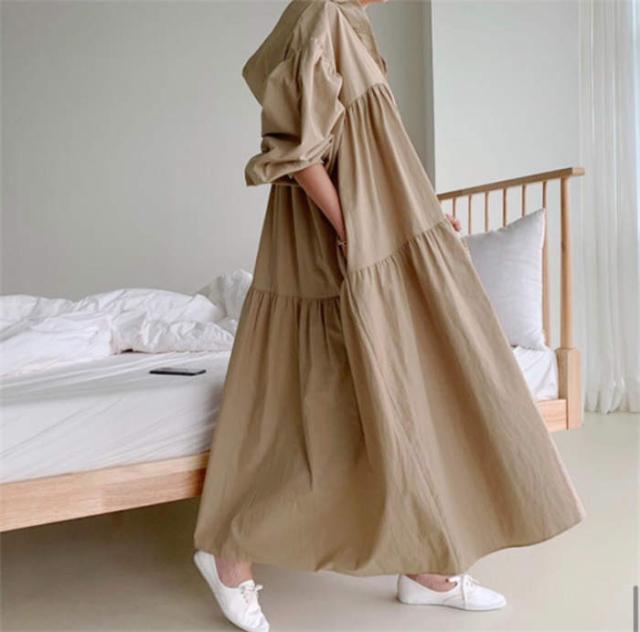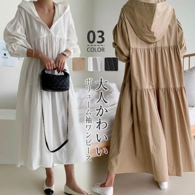 ワンピース ティアード ロング レディース ボリューム フード 春 秋 ロングワンピース 無地 フレアワンピース Aライン ギャザー シャツワンピース 長袖 シンプル 体型カバー 大きいサイズ 着回し