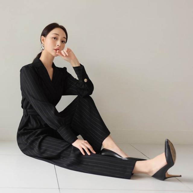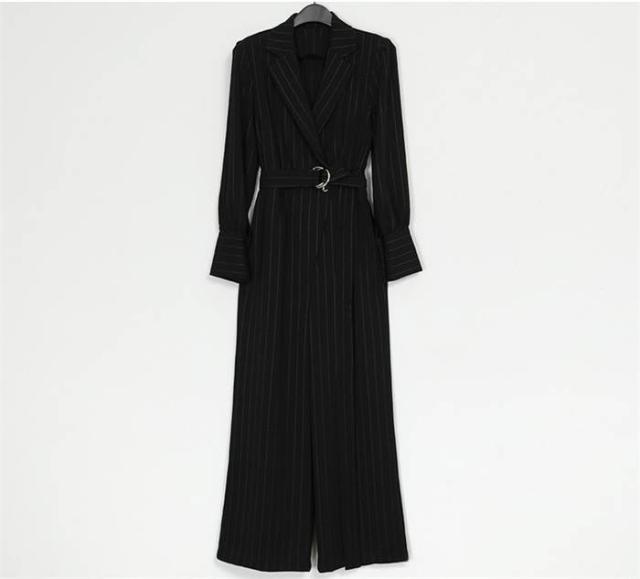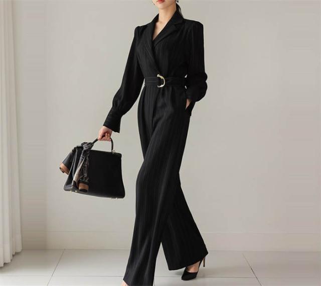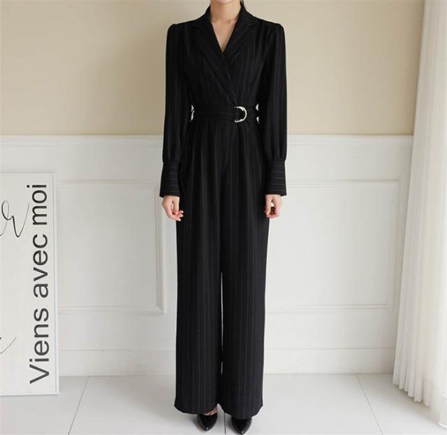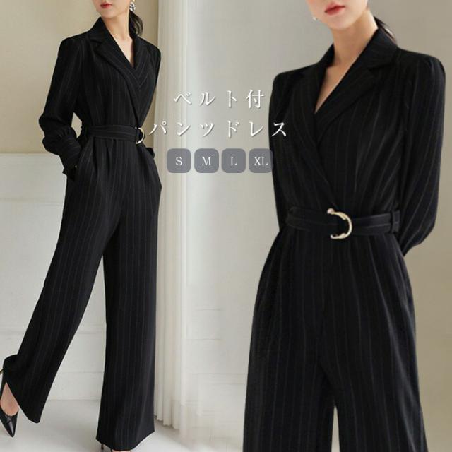 パンツドレス ストライプ柄 パンツスタイル パンツスーツ オールインワン パーティードレス 春秋 長袖 ロングパンツ ベルト カジュアル モード シンプル エレガント フォーマ おしゃれ