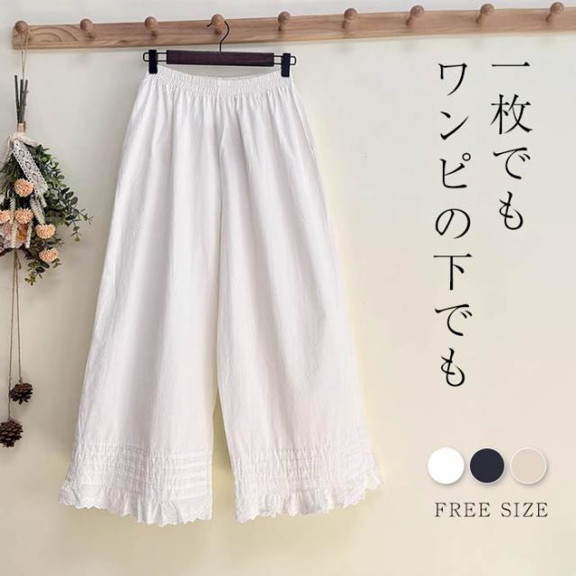 ワイドパンツ レディース パンツ 春 秋 ボトムス ガウチョパンツ ペチコート ペチパンツ 無地 重ね着 レイヤード 裾レース フリル ゆったり ナチュラル シンプル ウエストゴム 柔らか カジ 美脚