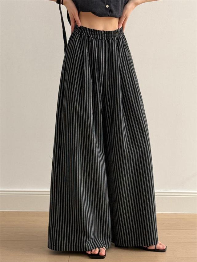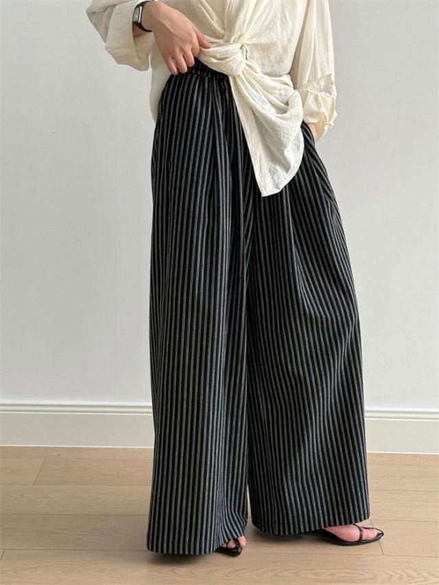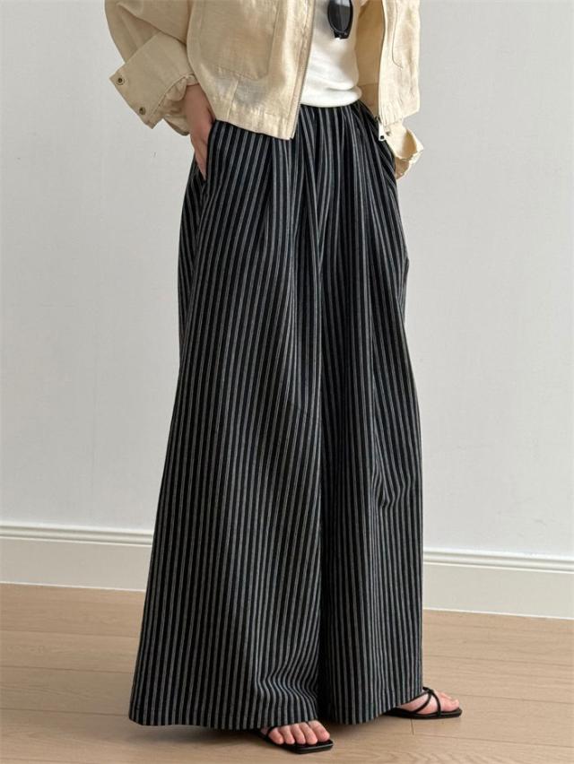ストライプパンツ レディース 春 夏 秋 ワイドパンツ ストライプ パンツ ボトムス ズボン 柄パン 総柄 キレイめ ワイド ガウチョ イージーパンツ 柄パンツ ハイウエスト ゴム サイドポケ ロング