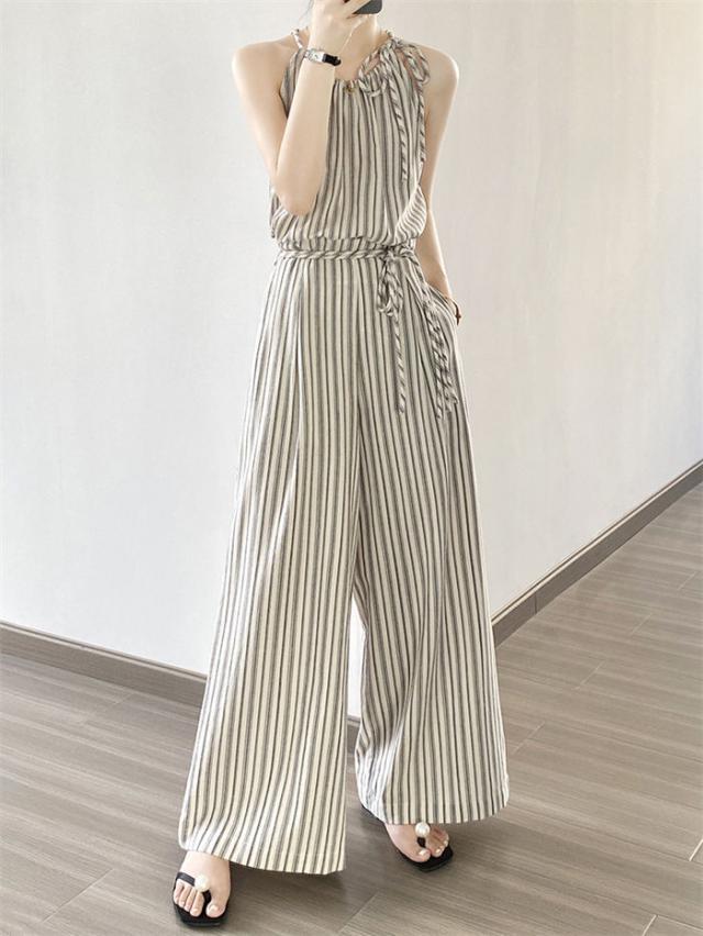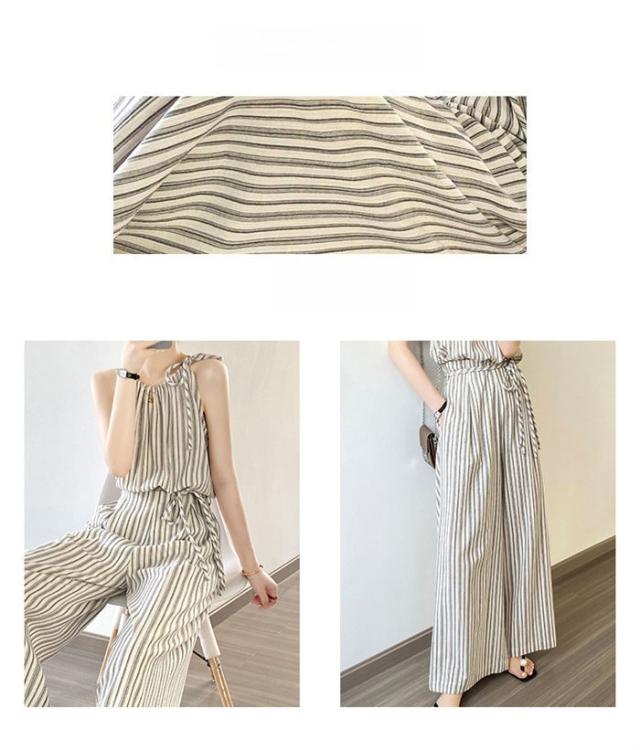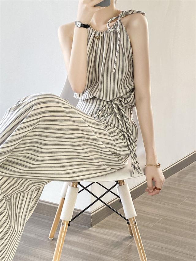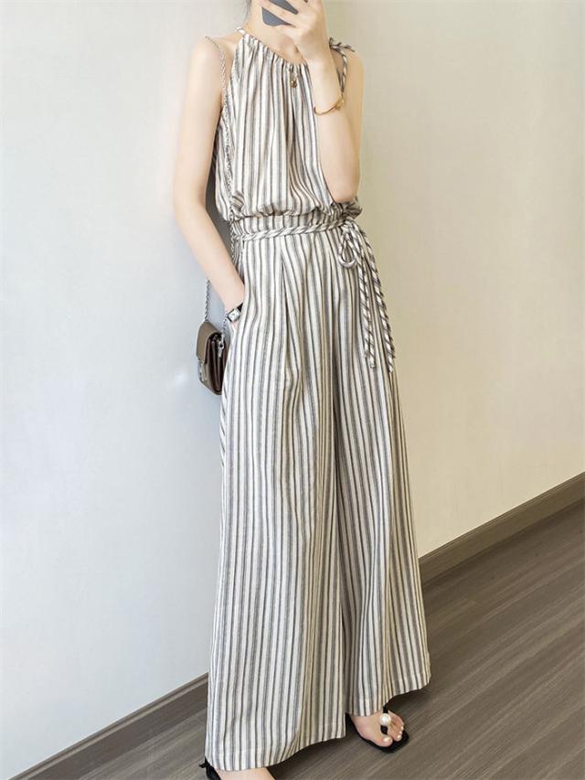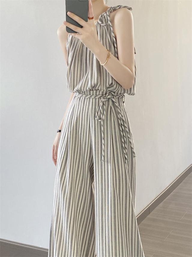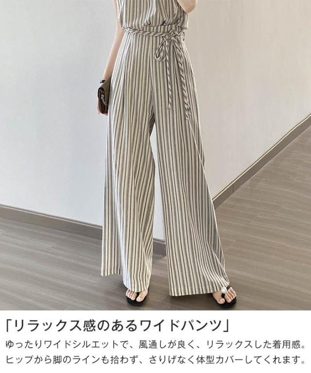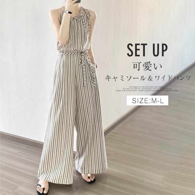 セットアップ レディース きれいめ 夏 ワイドパンツ ストライブ ノースリーブ キャミソール トップス 2点セット ロングパンツ ガウチョパンツ ゆったり 涼し 通気 デート お呼ばれ 外出 デイリー