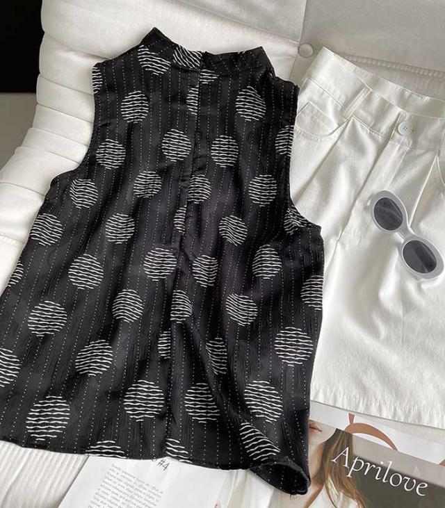ノースリーブ ブラウス トップス レディース ドット柄 春 夏 秋 プルオーバー シャツ タック スタンドカラー 高級感 きれいめ カジュアル クール カッコいい 上品 エレガント リゾート 個性的