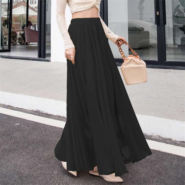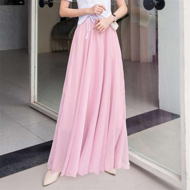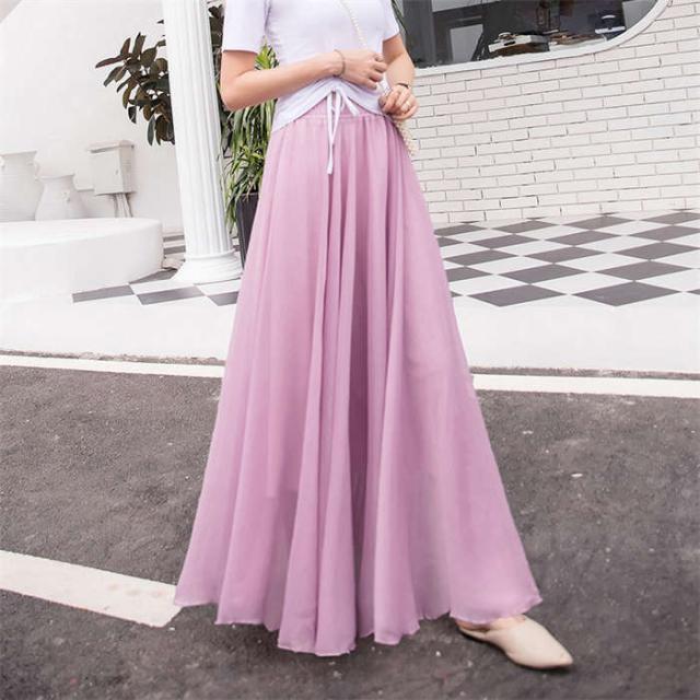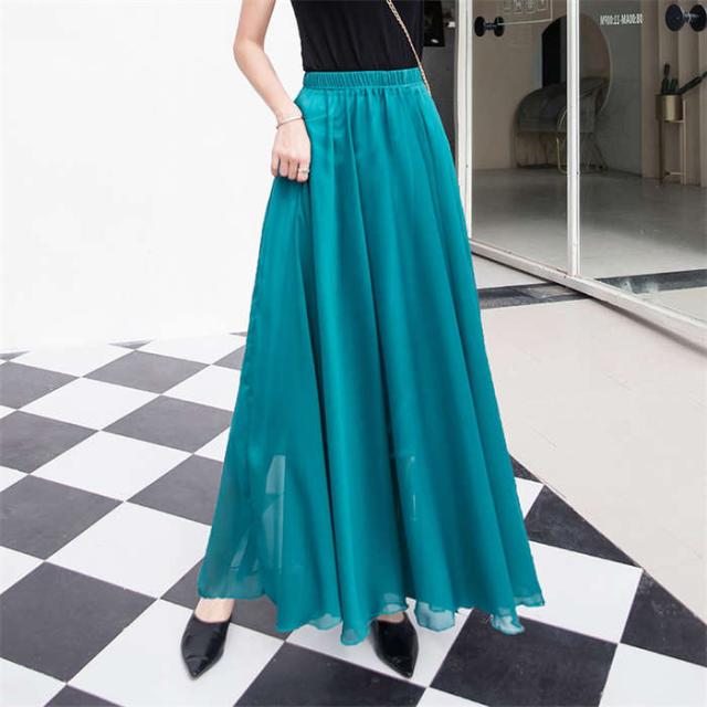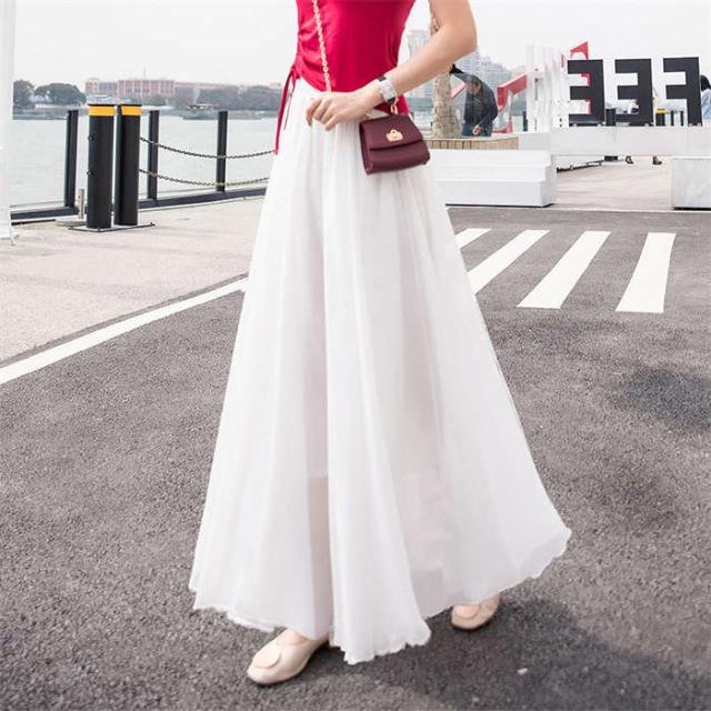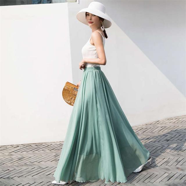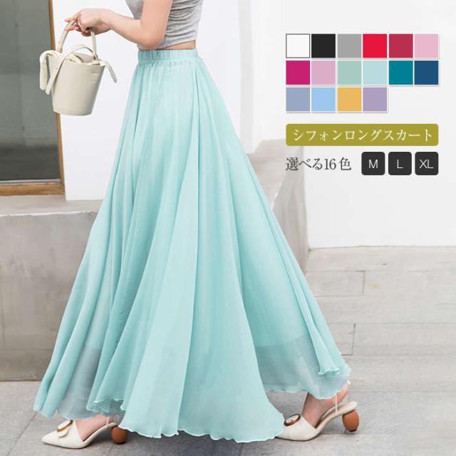 スカート レディース フレアスカート ボトムス ロングスカート Aラインスカート フレア ロング丈 夏 無地 裏地あり ウエストゴム チュールスカート2枚重ね リゾート シフォン ふんわり 体型カバー