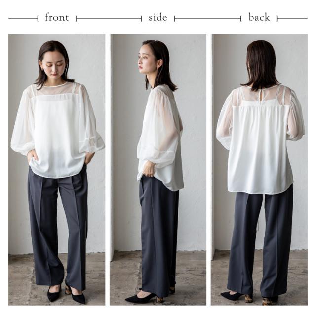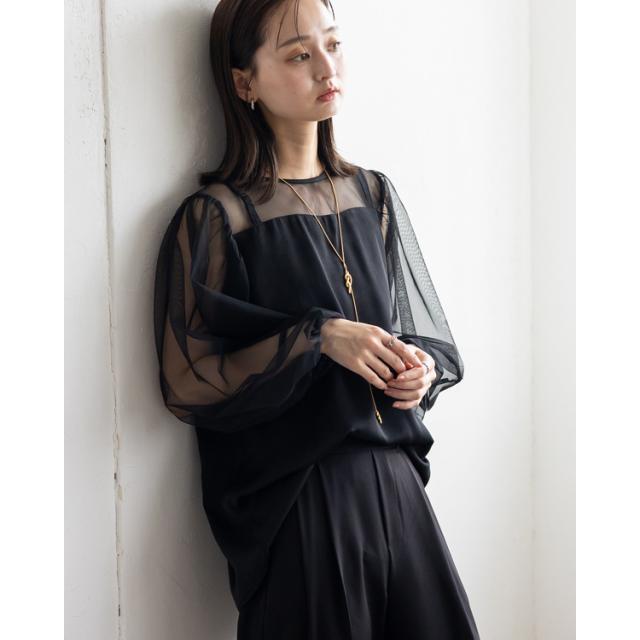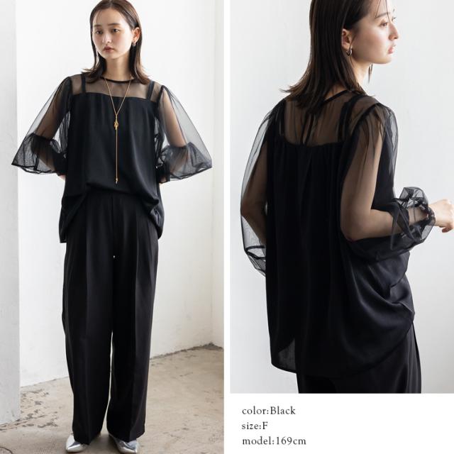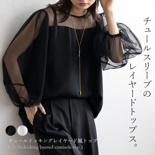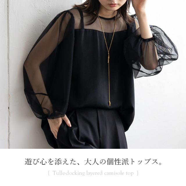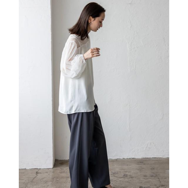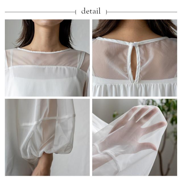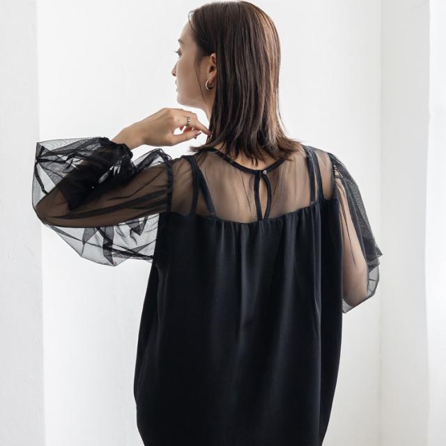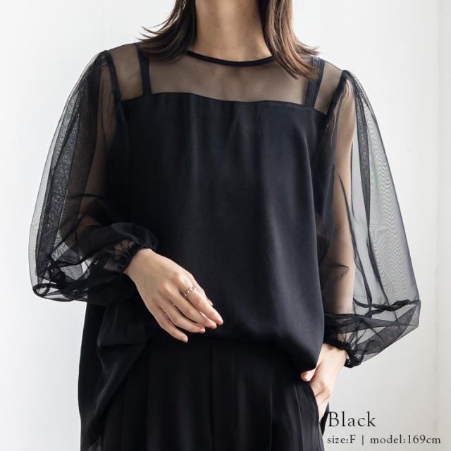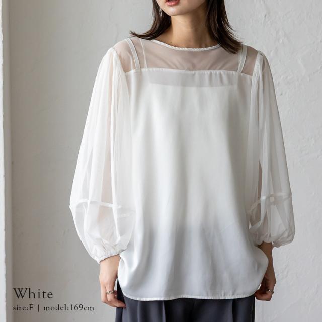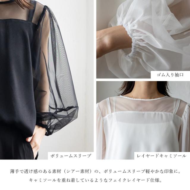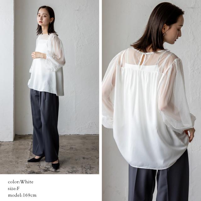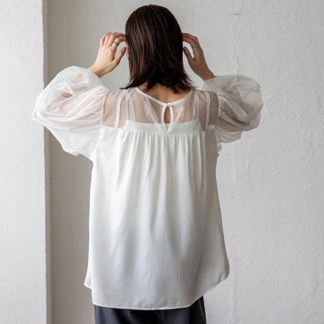 ブラウス レディース 長袖 薄手 シャツ レイヤード風 シースルー トップス ボリュームスリーブ 透け感 シアー素材 サテン生地 チュール おしゃれ オフィス 華奢見え おしゃれ 着回し 上品 ボリューム袖 【メール便】 nrc-0012