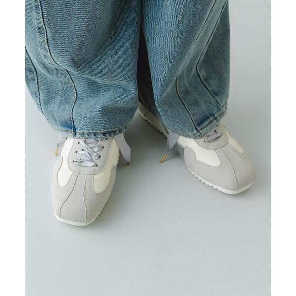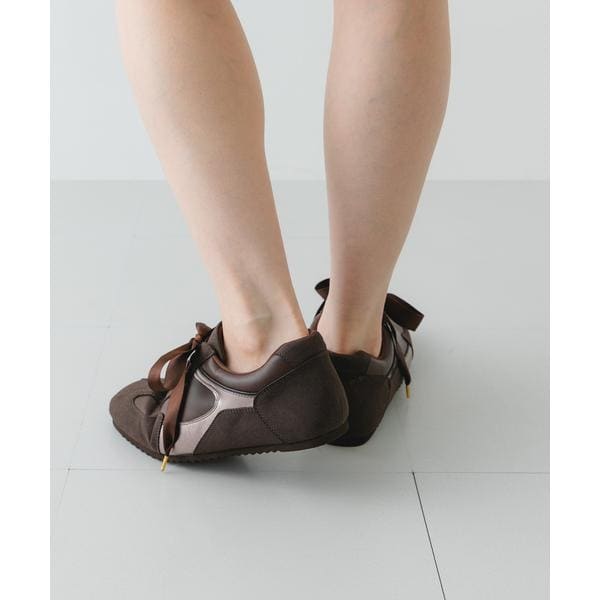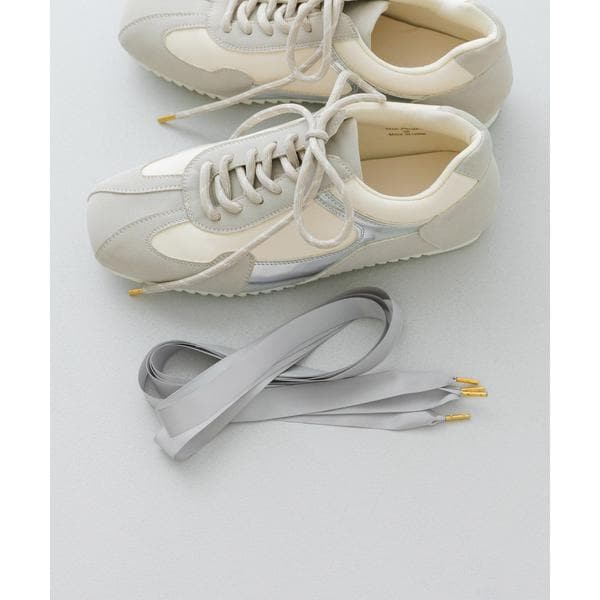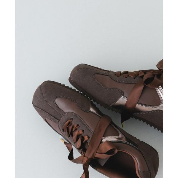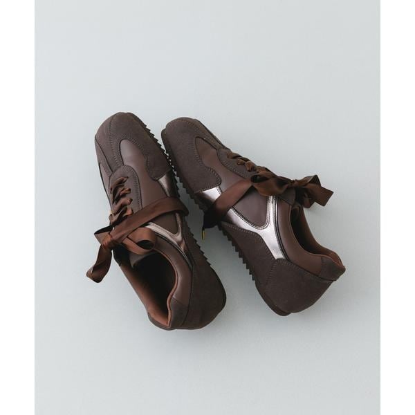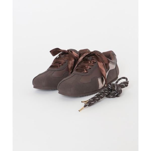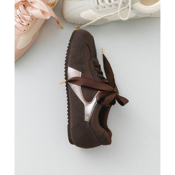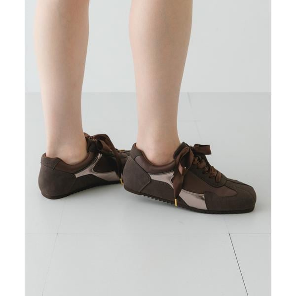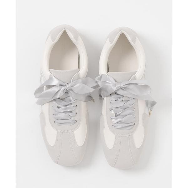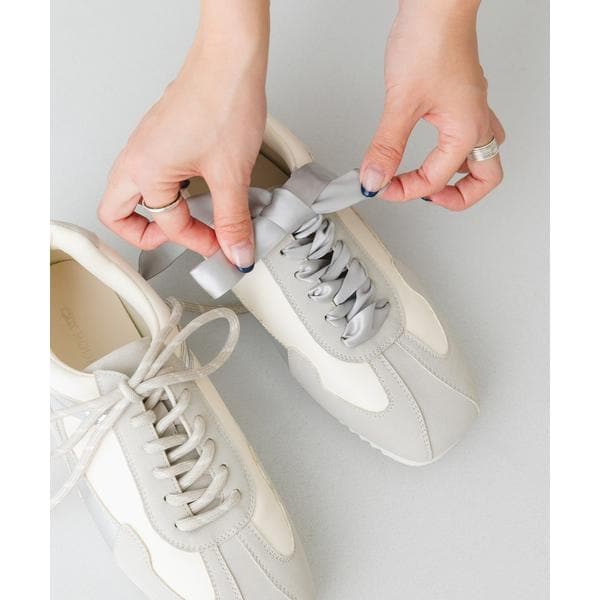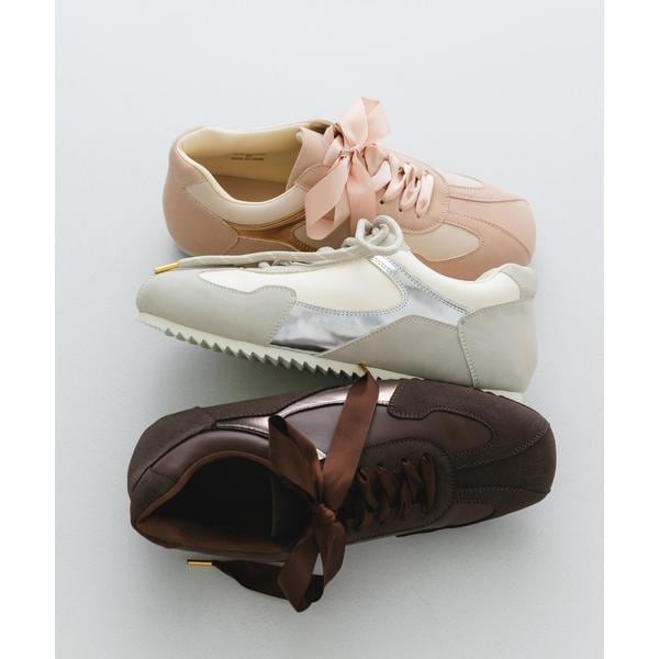 リボンタイプと通常の紐タイプのシューレースが2本付属しており、気分やコーディネートに合わせて使い分け可能。丸みのあるフォルムで女性らしく仕上げ、ソールは薄めでスニーカーながらもきれいめ見えするデザイン。2トーンカラー仕様でスポーティな印象を持たせつつ、大人かわいいピンク・ブラウン・グレーの3色展開。履き心地にもこだわり、デイリー使いに最適です。