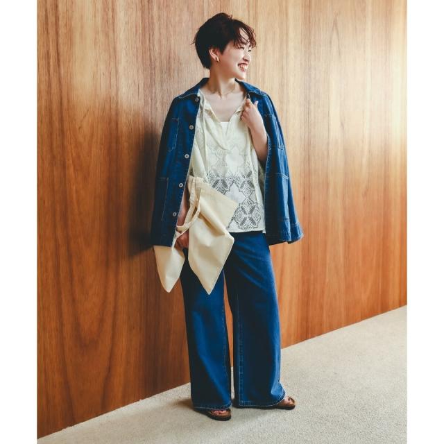 ゆるさのあるサイズと長め丈のシルエットで、ワンピースやレースアイテムなどの甘めなアイテムのハズしにオススメ。