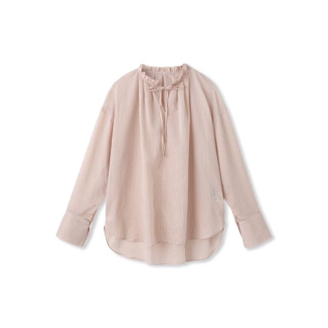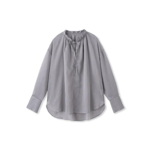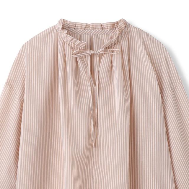 首元のフリルはひもで調整でき、ギャザーの寄せ具合によって印象を変えられるデザインです。