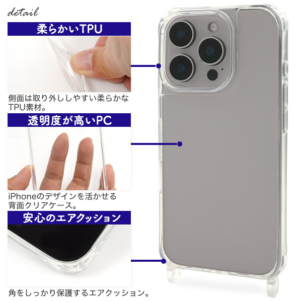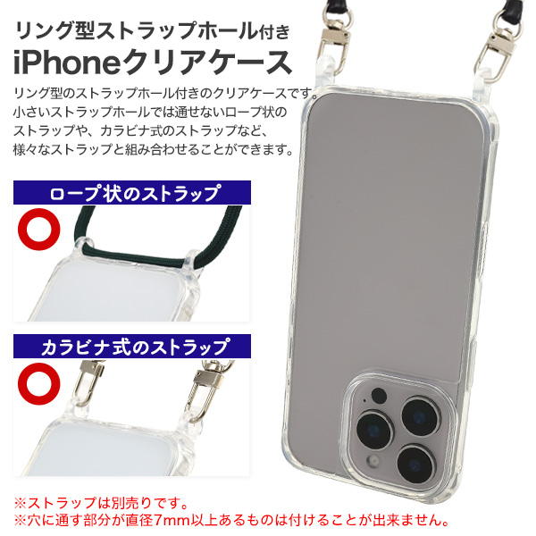 リング型のストラップホールは、小さいストラップホールでは通せないロープ状のストラップや、 カラビナ式のストラップなど様々なタイプのストラップと組み合わせることができます。 リング部分とケースが繋がっているので、金具と違い外れにくく、丈夫な作りになっています。 側面はソフトなTPU素材で着脱簡単!背面はiPhoneのデザインを活かせるクリアケースで、 角にはエアクッション付き!衝撃やキズなどからiPhoneを守るのはもちろん、 カメラや各種ボタンなどケースに入れたまま操作可能です。 ※ストラップは別売りです。 ※穴に通す部分が直径7mm以上あるものは付けることが出来ません。 | ||||||||||||