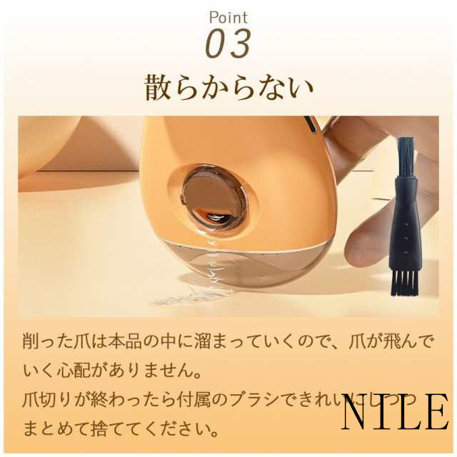 ネイルをカットするときに生じる切り屑は自動的に製品内部に収集されるので、切り屑が散らばることがなく、使用後に簡単に清掃でき、使いやすい環境を保つことができます。