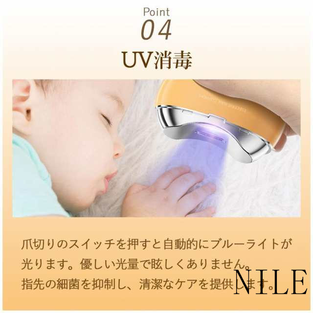 このネイルカッターは UV 消毒機能も備えています。使用中、ネイルカッターをネイルに向け、ボタンを押すと、自動的に UV 消毒ライトが点灯し、ネイル上のバクテリアを効果的に抑制し、清潔なネイルケア体験を提供します。特に赤ちゃんのネイルケアに適しています。