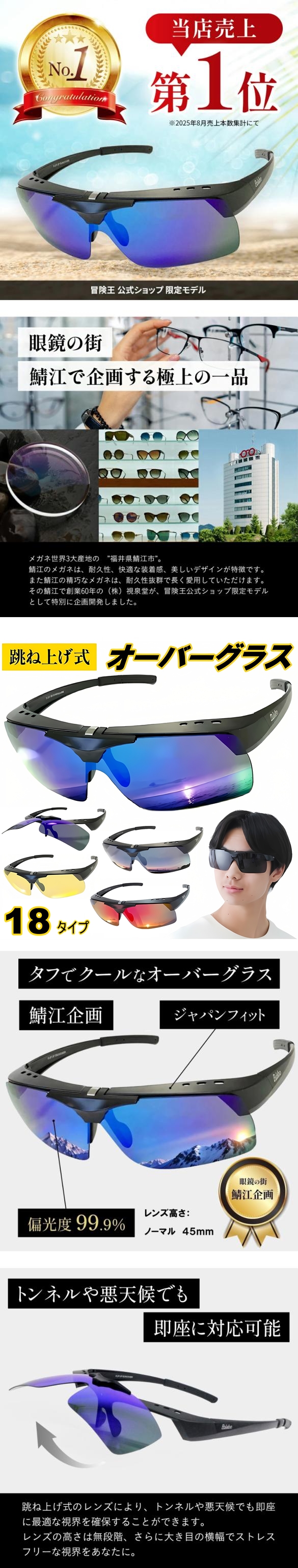 冒険王 跳ね上げ式オーバーグラス サングラス 偏光 遮光 オーバーグラス メンズ レディース uv ブルーライト 紫外線 カット ミラー 最強 夜 夜用 大きめ アウトドア 釣り スポーツ ゴルフ 野球 テニス マラソン ランニング ドライブ バイク 運転 グラデーション 鯖江