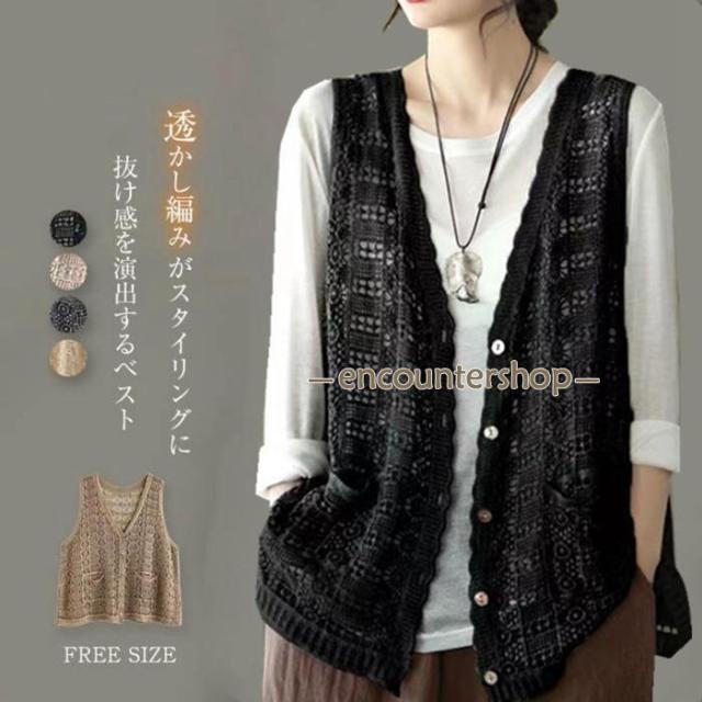 ベスト レディース 春夏 透かし編み ニット ベスト vネック レディース 春夏 ベスト ジレ レディース 前開き おしゃれ サマー ベスト レディース トップス ゆったり 夏 綿 重ね着 レイヤード カジュアル 通勤 可愛い 30代 40代