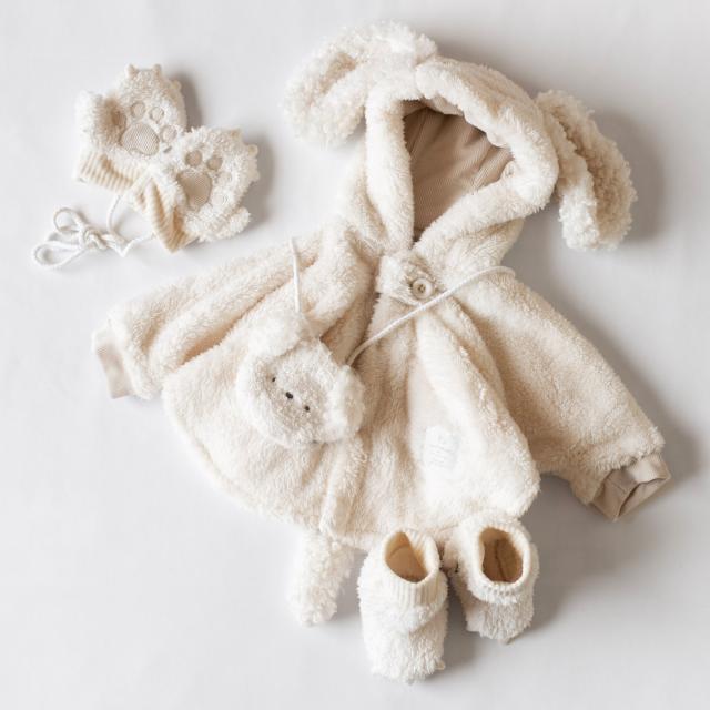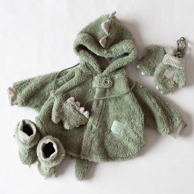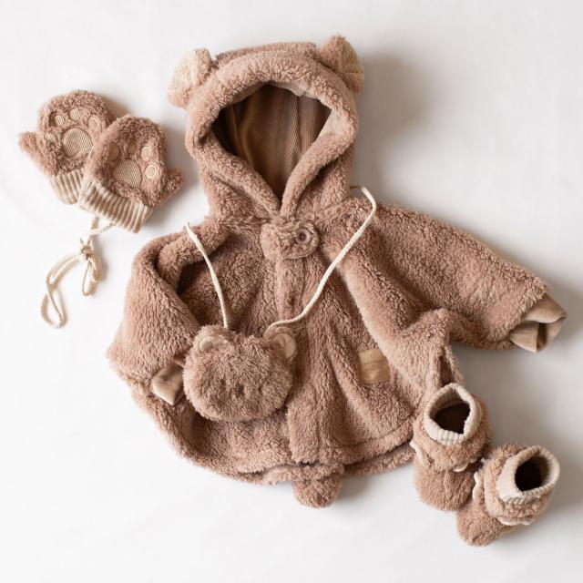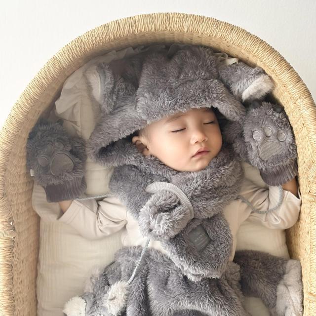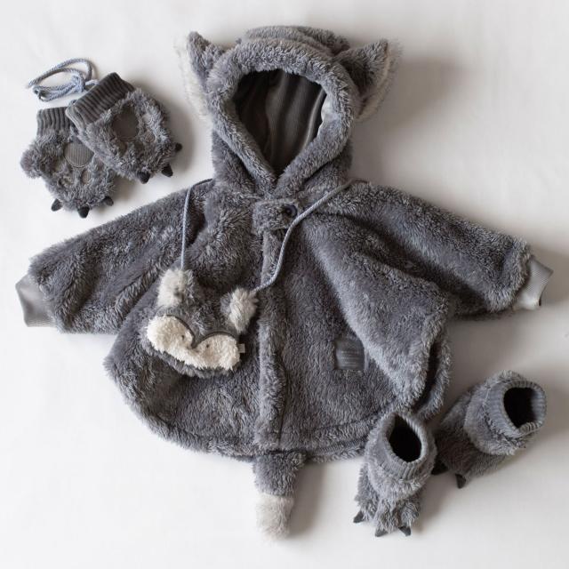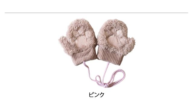手のひらの肉球がキャッチーなデザイン。あったかモコモコ生地のベビーミトンです。肉球型の刺繍や、爪のデザインが写真映え抜群。片方だけ紛失してしまわないように、紐で繋がっているのも嬉しいポイントです。お揃いのぬいぐるみケープやスーツと合わせたコーディネートがおすすめです。