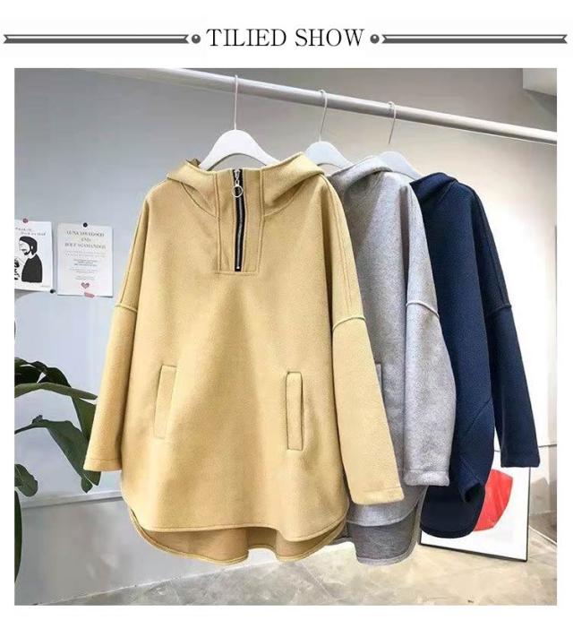 パーカー 秋冬 長袖 ハーフジップ 大きめ パーカー ハイネック 無地 フード付き ラウンド裾 ドルマンスリーブ ポケット付き パーカー 韓国ファッション ルームウェア おしゃれ かわいい