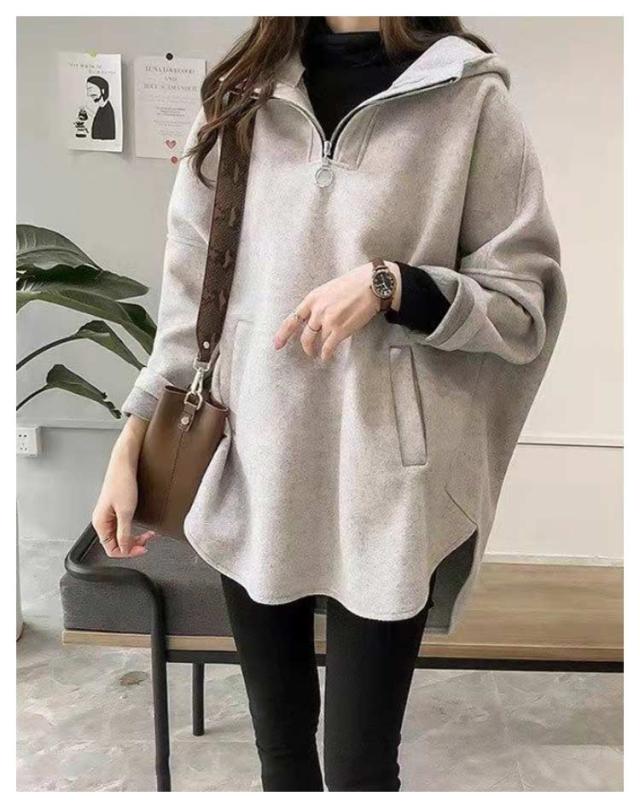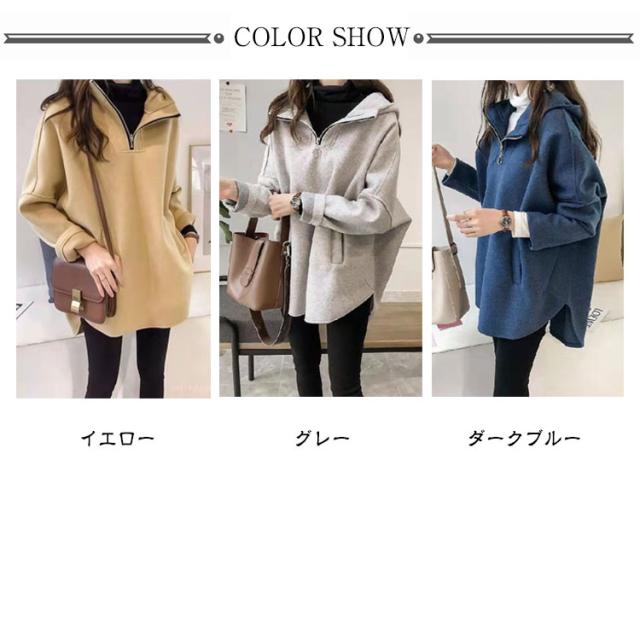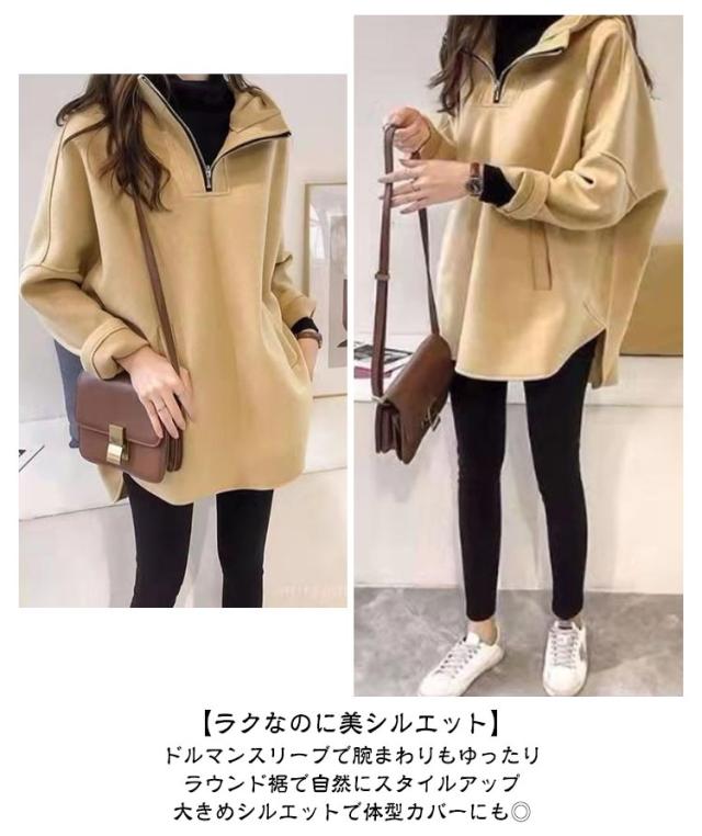 長袖 パーカー ポケット付き ハーフジップ フード付き 大きめ ハイネック 無地 パーカー パーカー ドルマンスリーブ ラウンド裾 レディース 韓国ファッション ルームウェア おしゃれ かわいい