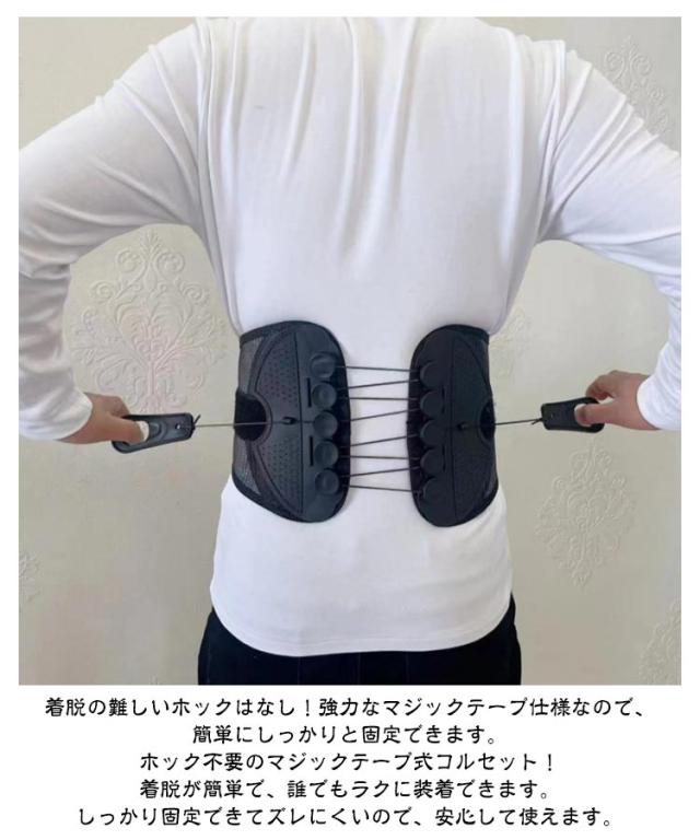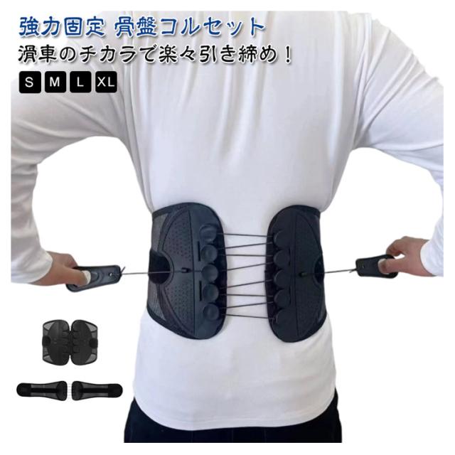 | 滑車のチカラで楽々引き締め!強力固定 骨盤コルセット 軽い力でしっかり固定できるコルセット! 滑車が内蔵された構造で、滑車の原理を活かし、弱い力でもしっかりと骨盤を引き締めることができます。 通常の骨盤ベルトやコルセットでは満足できなかった方にも! サイズが合わなかったり、しっかり固定できなかった経験がある方も、この滑車式コルセットなら簡単&安定して使えます。 腰痛対策に最適な骨盤コルセット。骨盤を正しい位置で支え、姿勢を整えることで、腰への負担を軽減。腰痛の予防・緩和をサポートします。 腰痛軽減のためのコルセットとして大人気!腰にしっかりフィットし、痛みを感じにくく、動きやすさも確保。日常生活や仕事中の腰をサポートします。 姿勢矯正にも使える多機能コルセット。猫背や骨盤の歪み、ぽっこりお腹の改善にも効果的。普段の姿勢からしっかり見直したい方におすすめの骨盤コルセットです。 通気性抜群のコルセット。通年使用できるメッシュ素材を採用しており、長時間の装着でもムレにくく快適!季節を問わずオールシーズン使える実用的な設計です。 着脱の難しいホックはなし!強力なマジックテープ仕様なので、簡単にしっかりと固定できます。 ホック不要のマジックテープ式コルセット!着脱が簡単で、誰でもラクに装着できます。しっかり固定できてズレにくいので、安心して使えます。 S〜2XLとサイズ展開豊富!小さいサイズから大きいサイズまであるので、レディース・メンズ問わず、20代 30代 40代 50代 60代と世代問わずご使用いただける骨盤ベルト兼用コルセットです。 腰痛が気になる方、猫背やぽっこりお腹が気になる方、姿勢の歪みが気になる方、むくみが気になる方、腰に負担がある作業をする方、産前産後の骨盤ケア、家事や仕事をしながら体型改善など…様々なシーンでご使用いただけます。 骨盤ベルトとコルセットのいいとこ取り!オフィスやリモートワークでデスクワークが多い方、おうち時間が多く座っている時間が長い方にもオススメです。 骨盤サポーターなのにガードルのような使用感!薄型設計の骨盤コルセットだから、洋服の下にも着用可能。まるでガードルのように使えて、体型補正やボディメイクにもぴったりです。 整体級のスッキリ感が得られるコルセット!自宅で手軽に骨盤ケアができ、猫背矯正・姿勢矯正・骨盤矯正のサポートに大活躍。 ダ | |