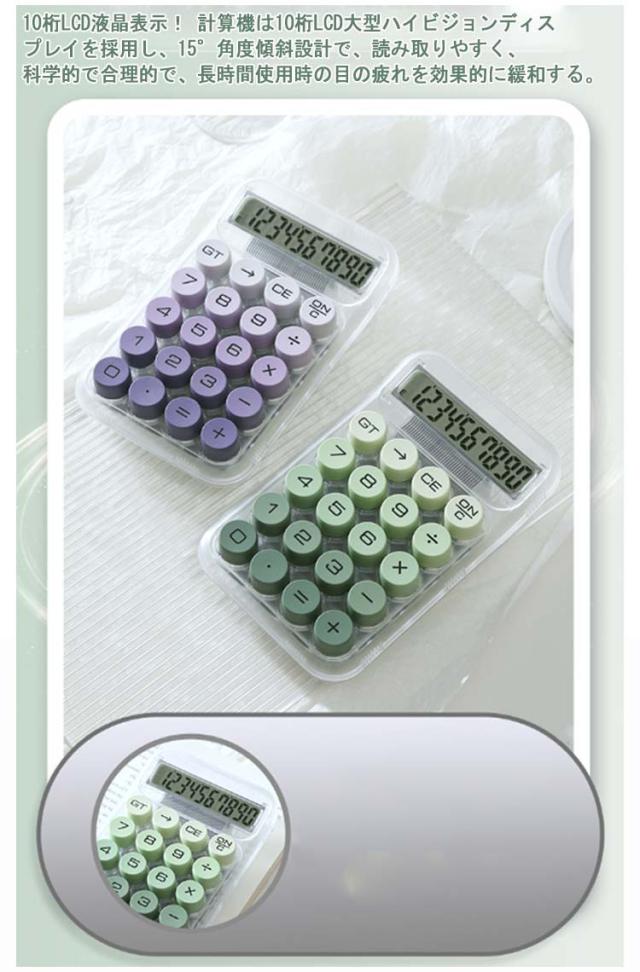 | かわいい美学計算機。電卓はグラデーションカラーと大きなレトロな丸ボタンを採用し、簡潔で美しい。サイズは卓上用に適しており、手持ち用にも適しています。快適な感触とおしゃれな外観が、仕事、勉強、ビジネス、日常生活に新たな活力を注入します! 立体的なキーボードは丸くて指にフィットするので、押しやすいです。 10桁LCD液晶表示! 計算機は10桁LCD大型ハイビジョンディスプレイを採用し、15°角度傾斜設計で、読み取りやすく、科学的で合理的で、長時間使用時の目の疲れを効果的に緩和する。 電池が交換可能!いつでも安心してご使用いただけます。 裏面に滑り止めが付いており、本体が滑らないようになっています。 非常にコンパクトで持ち運び可能で軽量です。 様々な適用場所!グラデーションの多彩なファッションコーディネートは、さまざまなシーンのニーズに対応しています。可愛い小型の計算機は、家庭、学校、オフィス、商売計算、ビジネス、仕事用、薄記、看護師、学生、さまざまな祝日の贈り物などに最適です。 | |
