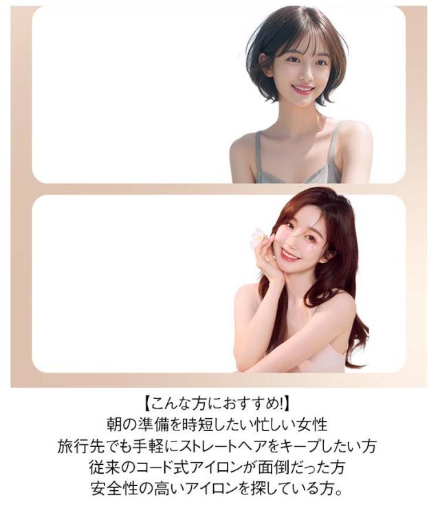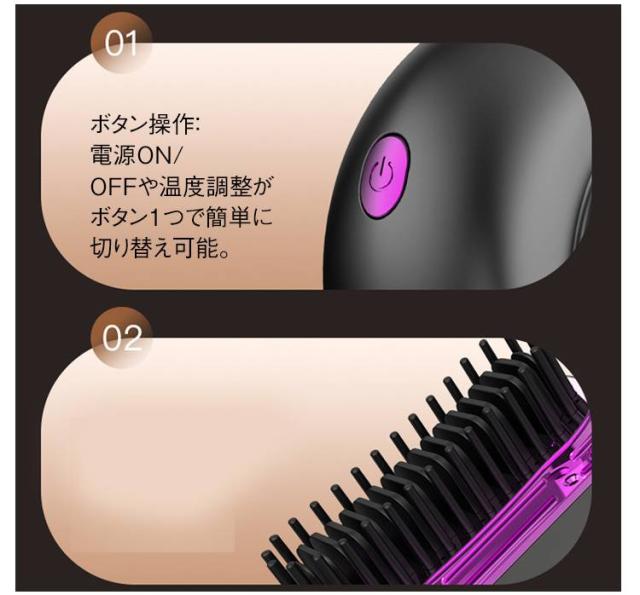 | TYPE-C充電対応:最新の充電方式で、スマホと同じケーブルで簡単充電可能。 ボタン操作:電源ON/OFFや温度調整がボタン1つで簡単に切り替え可能。 3段階温度調節(低温・中温・高温):髪質やスタイリングの目的に合わせて最適な熱量を選択できます。 約219gで超軽量:長時間使っても手が疲れず、ストレスフリー 片手でラクラク操作:コンパクト設計でバッグに入れても邪魔になりません。 カバー付き:使用後はカバーを閉めて収納でき、ほこりや傷から保護。熱い部分に直接触れない設計で、肌や髪を安全にキープ。 髪を挟まない!やさしいスタイリング コーム型のプレート設計により、髪を挟まずに自然なストレートヘアを実現します。特に顔周りや前髪など、細かい部分にも対応できるデザインが魅力です。何度もプレスする必要がないため、髪への負担も軽減されます。自然な仕上がりを求める方に最適なアイテムです。 男女ともOKな3カラー展開! 洗練されたブラックとグレーとホワイトの3色から選べるデザインで、毎日のスタイリングがより楽しくなります。性別や年齢を問わず使いやすく、プレゼントにもぴったりです。 【こんな方におすすめ!】 朝の準備を時短したい忙しい女性 旅行先でも手軽にストレートヘアをキープしたい方 従来のコード式アイロンが面倒だった方 安全性の高いアイロンを探している方。 | |