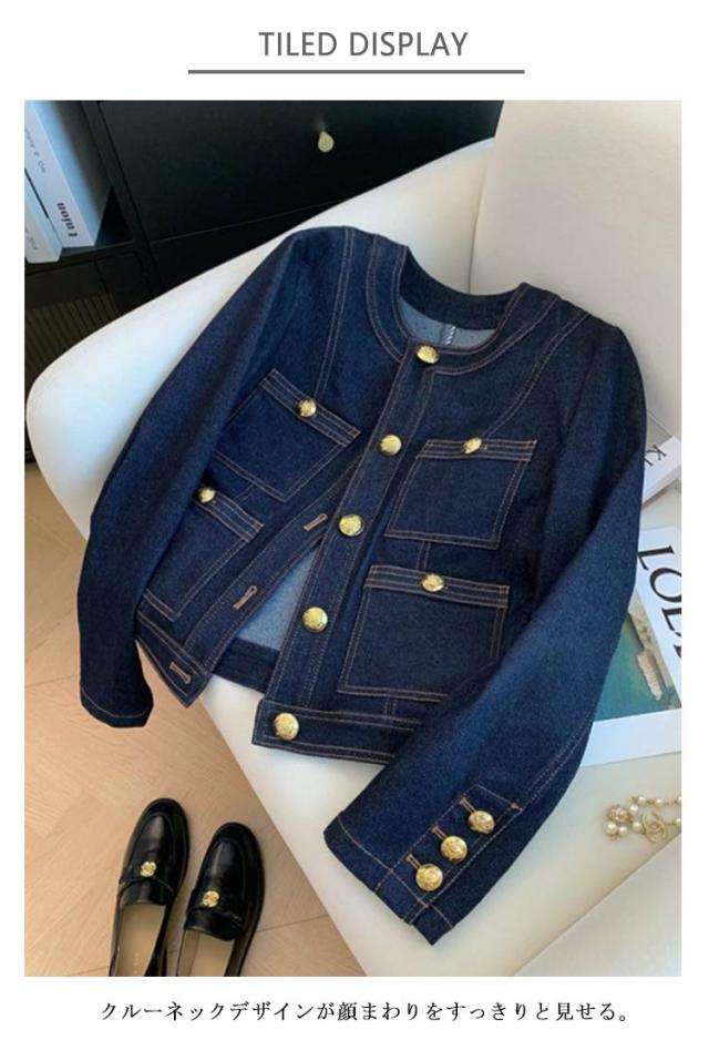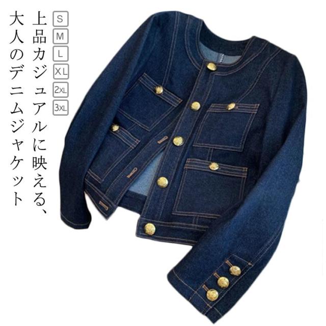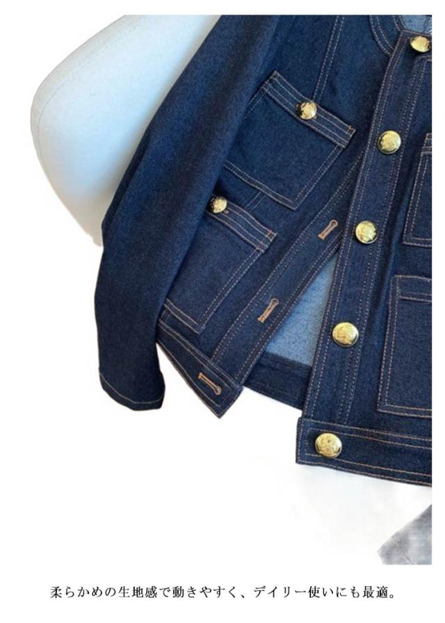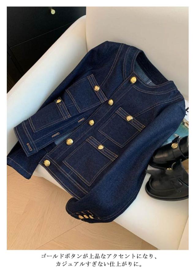 金ボタン ノーカラー きれいめ レディース デニムショートジャケット ジャケット ジージャン デニムジャケット 大人 30代 ノーカラージャケット ゴールドボタン Gジャン 40代 50代 デニムジャケット ショート丈 可愛い トレンド 春 夏 秋 アウター 羽織り 通勤 通学 お出かけ