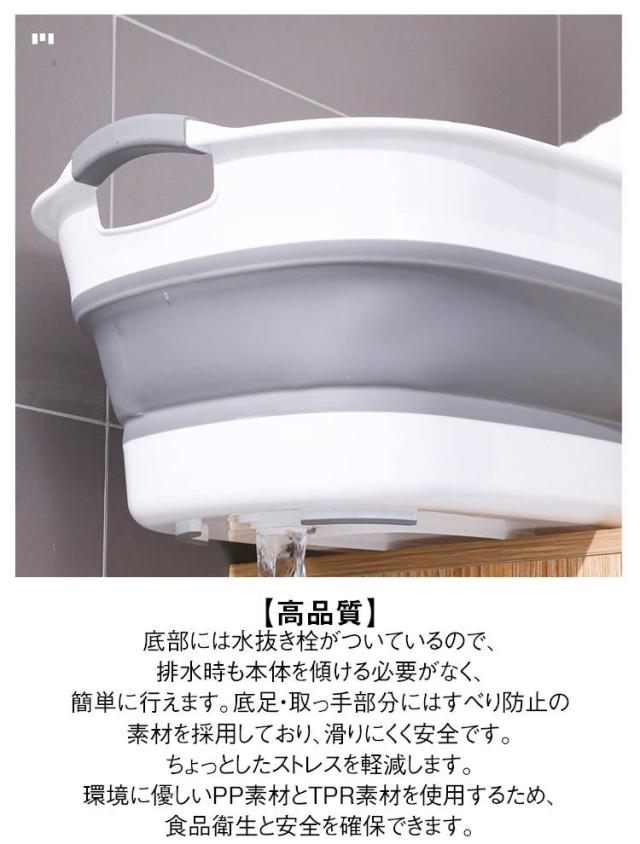 | 【ベビーバス&ペットバス 多機能 折りたたみ 3色×2サイズ】 【多機能、多用途】洗濯物の浸け置き用、犬猫のバスタブ、衣類のつけ置き用、赤ちゃんの沐浴用、災害時の断水前に水の蓄え用、収納用、また、ゴミ箱、お部屋の収納には家庭用のよいものだ!キャンピング、旅行のとき、さまざまなものを収納できる。さすがに多機能な洗い桶です。 【高品質】底部には水抜き栓がついているので、排水時も本体を傾ける必要がなく、簡単に行えます。底足・取っ手部分にはすべり防止の素材を採用しており、滑りにくく安全です。ちょっとしたストレスを軽減します。環境に優しいPP素材とTPR素材を使用するため、食品衛生と安全を確保できます。 【底辺に滑り止め設計】 四隅に脚がついているので、排水も便利 【コンパクトに畳めて収納しやすい】 折りたためるタイプで省スペース。隙間に立てた保管や浴室の壁のフックに掛けることも可能。 | |