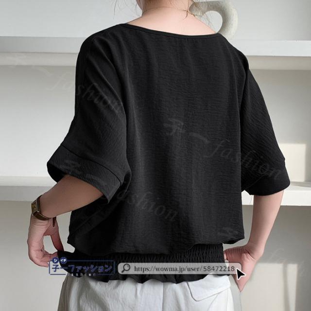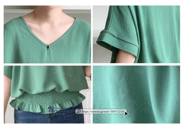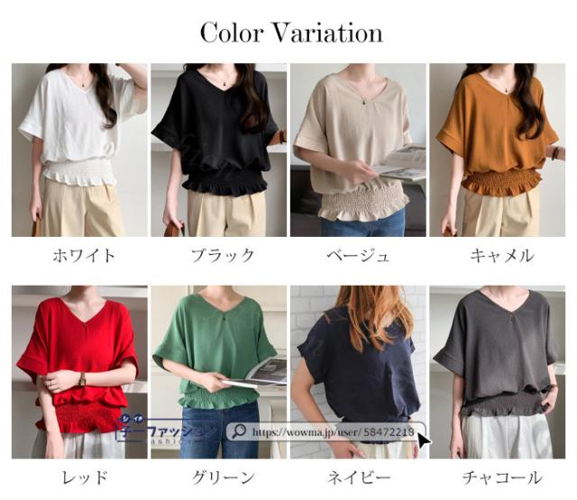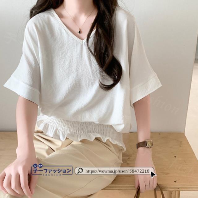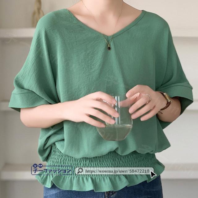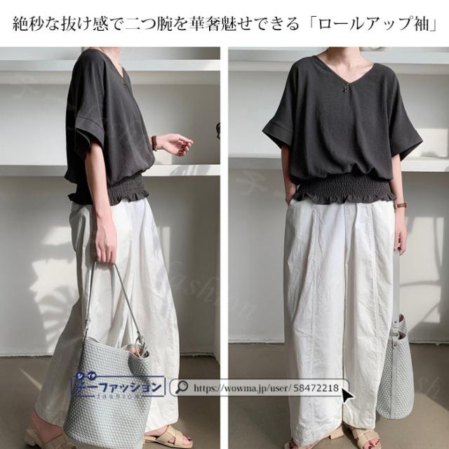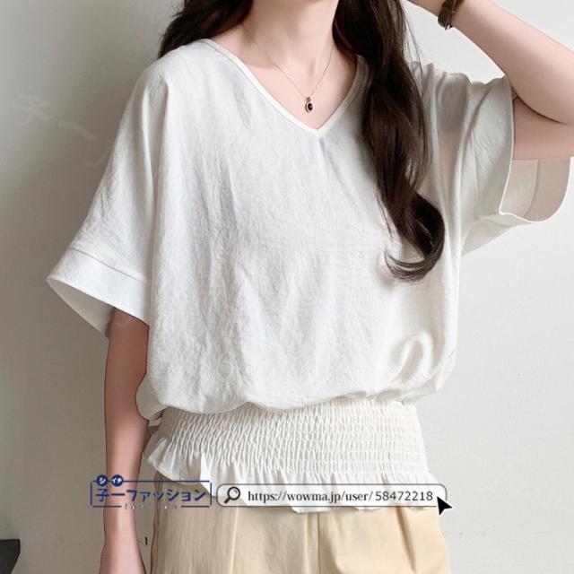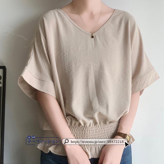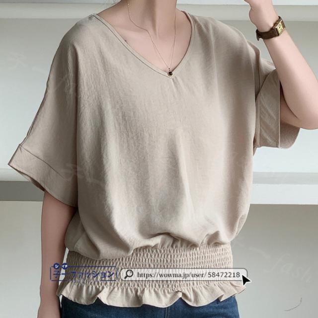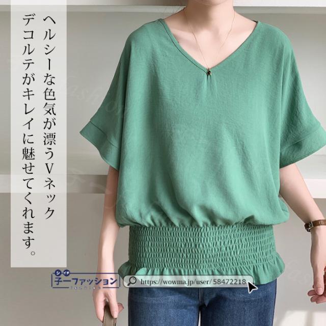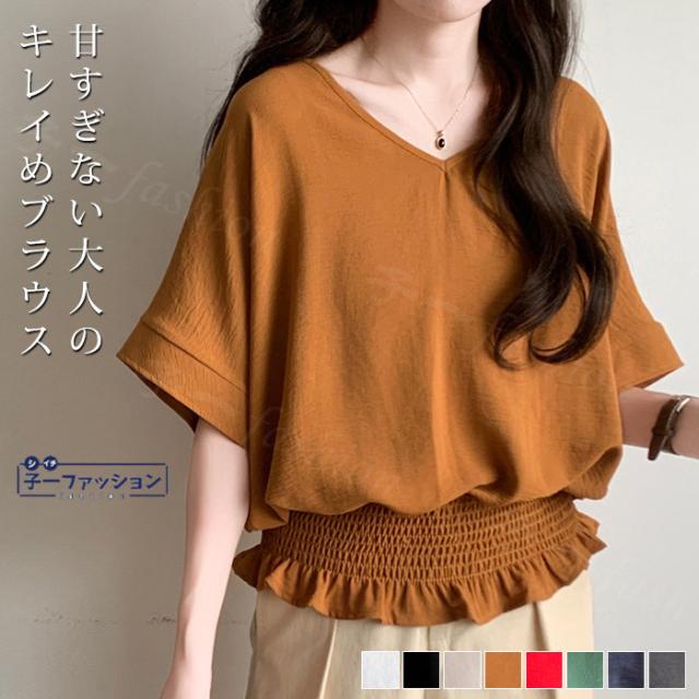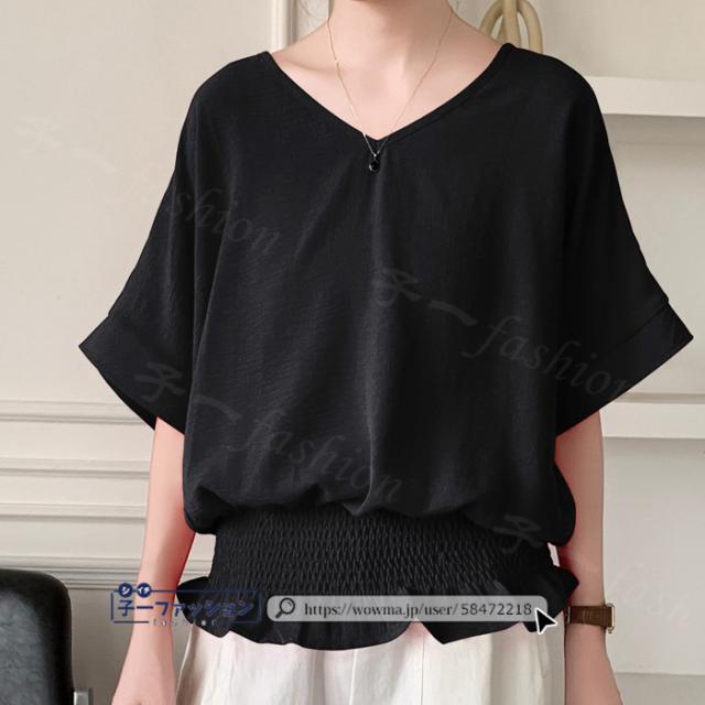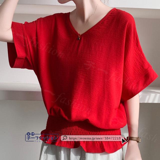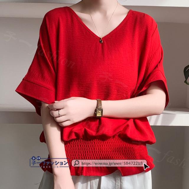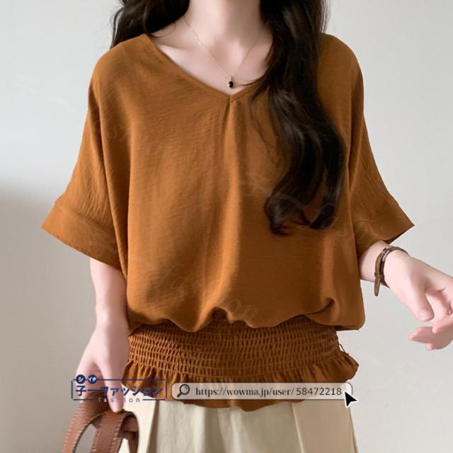 ブラウス ウエストシャーリング 半袖 薄手 新作 トップス シャーリングブラウス レディース vネックブラウス サマーブラウス 夏ブラウス 涼しい すっきり 無地 送料無料 バレンタイン