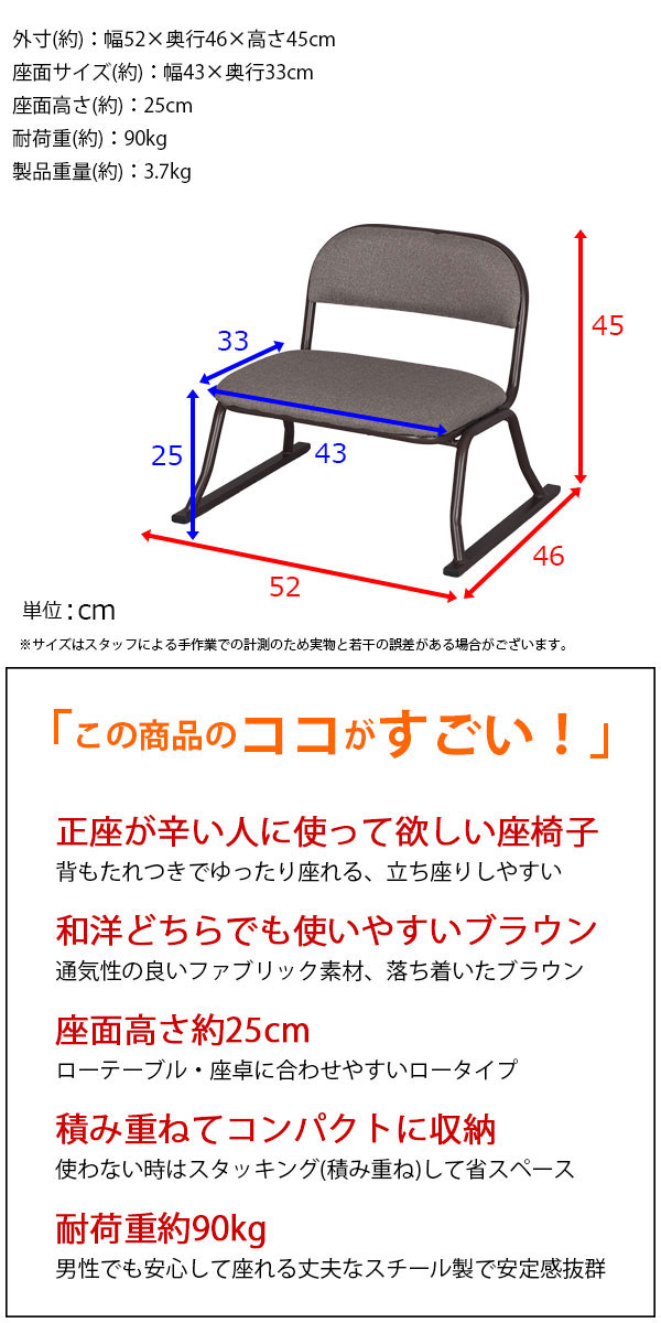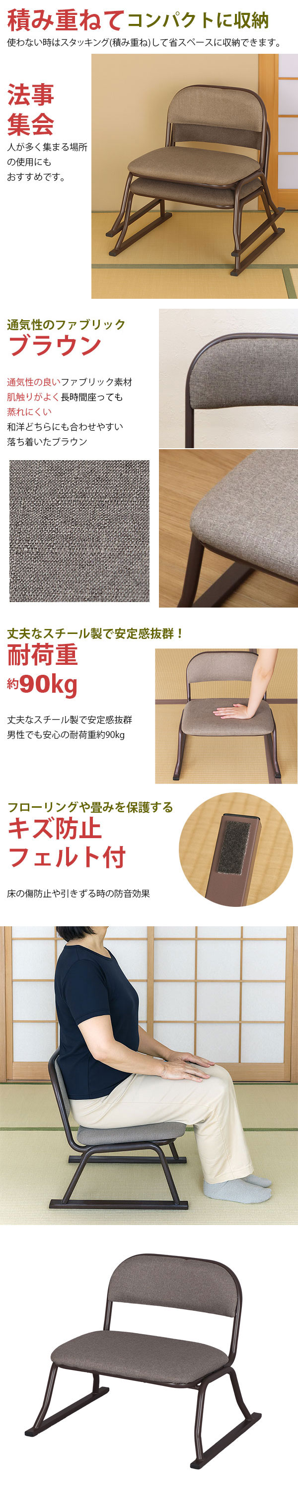 商品名:4脚セット 座椅子 脚付き 高座椅子 座面高さ25cm 完成品 幅52cm 奥行46cm 高さ45cm ブラウン ファブリック おしゃれ 法事用 座敷 椅子 仏壇椅子 法要 座いす 和室 椅子 低い椅子 高齢者 集会所 スタッキングチェア 丈夫 軽い コンパクト 積み重ね可能 組み立て不要 ERCL-800