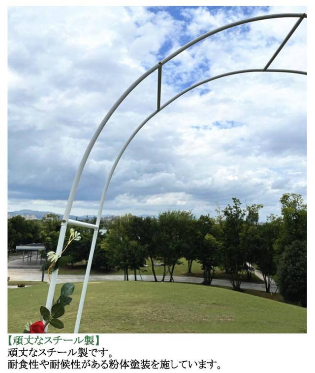 | 【お庭に華やかなインテリアアーチを】 薔薇やつる性の植物を支柱に絡ませるだけで玄関やお庭が華やかに! シンプルなデザインと対照的な丸み曲線でどの角度から見てもお花を綺麗に魅せられます。 【頑丈なスチール製】 頑丈なスチール製です。耐食性や耐候性がある粉体塗装を施しています。 【掛けたり吊るしたりすることも】 ハンギングプランターやバスケットなどを吊るすとワンランク上の素敵な庭を作れます。 【用途】 玄関 庭 結婚式 誕生日パーティー クリスマス 野外コンサート イベントなど | |