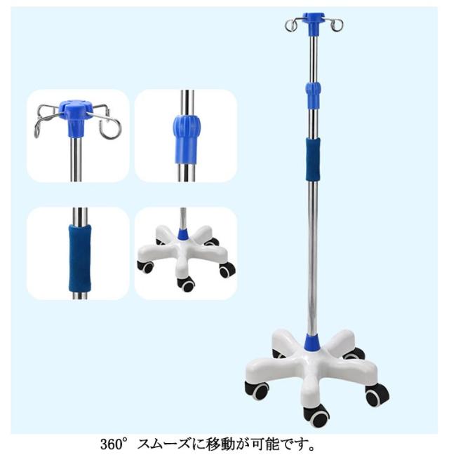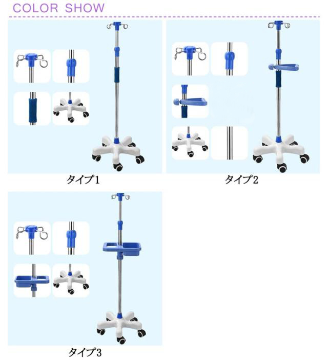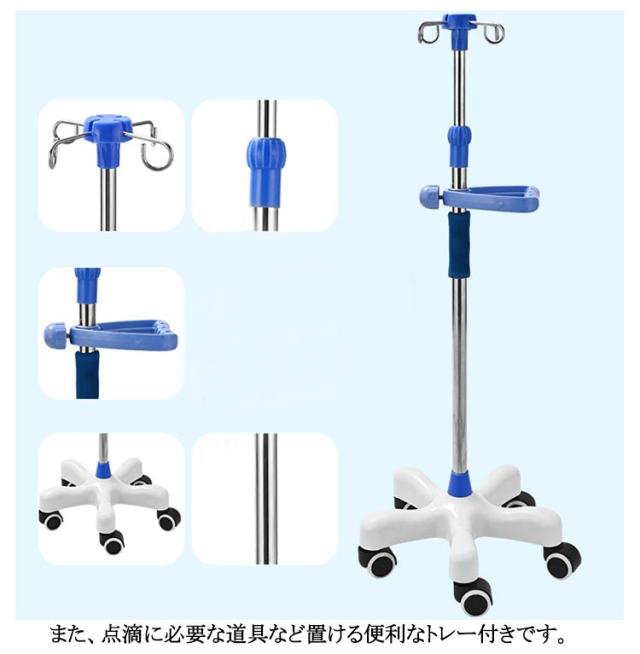 | 3タイプ選べる!点滴スタンド 5本脚キャスターで安定性抜群 高さ調節可能 5つのキャスター付きの脚で安定感があり、転倒の心配も軽減してくれます。 360°スムーズに移動が可能です。 また、点滴に必要な道具など置ける便利なトレー付きタイプもあります。 自由に調節が可能!子供から大人まで、ご使用頂く方の身長や使用場所に合わせて自由に高さを変更できます。 適用範囲は病院 療養院 診療所 家庭 コミュニティ 家庭看護 診療所 ペット診療所 美容院など。 | |