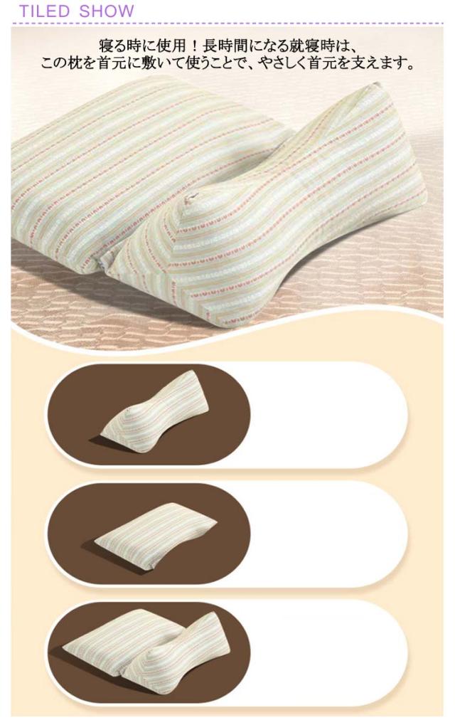 | ストレートネック・ストレッチ枕。首こり、肩こり解消! 首・肩まわりを伸ばしてストレッチ。首に敷いて仰向けになるだけ。 外して洗える清潔な枕カバー。さらりとした肌触りで、蒸れにくい生地です。 寝る時に使用!長時間になる就寝時は、この枕を首元に敷いて使うことで、やさしく首元を支えます。 つらい首・肩に!首・肩まわりを伸ばしてストレッチ。ストレートネック症状でカチコチの首に。 長時間座る必要があるオフィスワーカーの方、在宅勤務やテレワークで腰に不安がある方はもちろんですが力仕事や家事でお疲れの方にオススメです。 | |