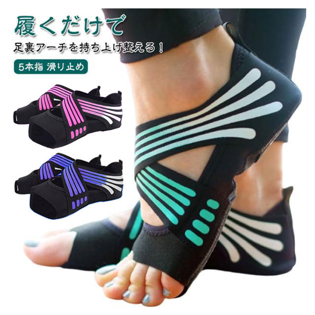 | 履くだけで足裏アーチを持ち上げ整える! 5本指 滑り止め 履いている間、土踏まずがギュッと持ち上げられ、足裏アーチを形成します。 クロスベルトで抜群の安定感で姿勢調整してくれます。 つま先なしで、指の間が広がって、蒸れにくく、長時間使用しても窮屈感を感じません。 伸縮性のあるネオプレン素材で、柔らかくてフィット感に優れています。 水洗い可能な為、いつでも清潔に使用いただけます。 滑り止め付き・脱着簡単なので、ルームシューズとしてもぴったりです。 ピラティス、バレエ、スポーツジムでのトレーニングや筋トレ、ストレッチ等で活躍。 | |